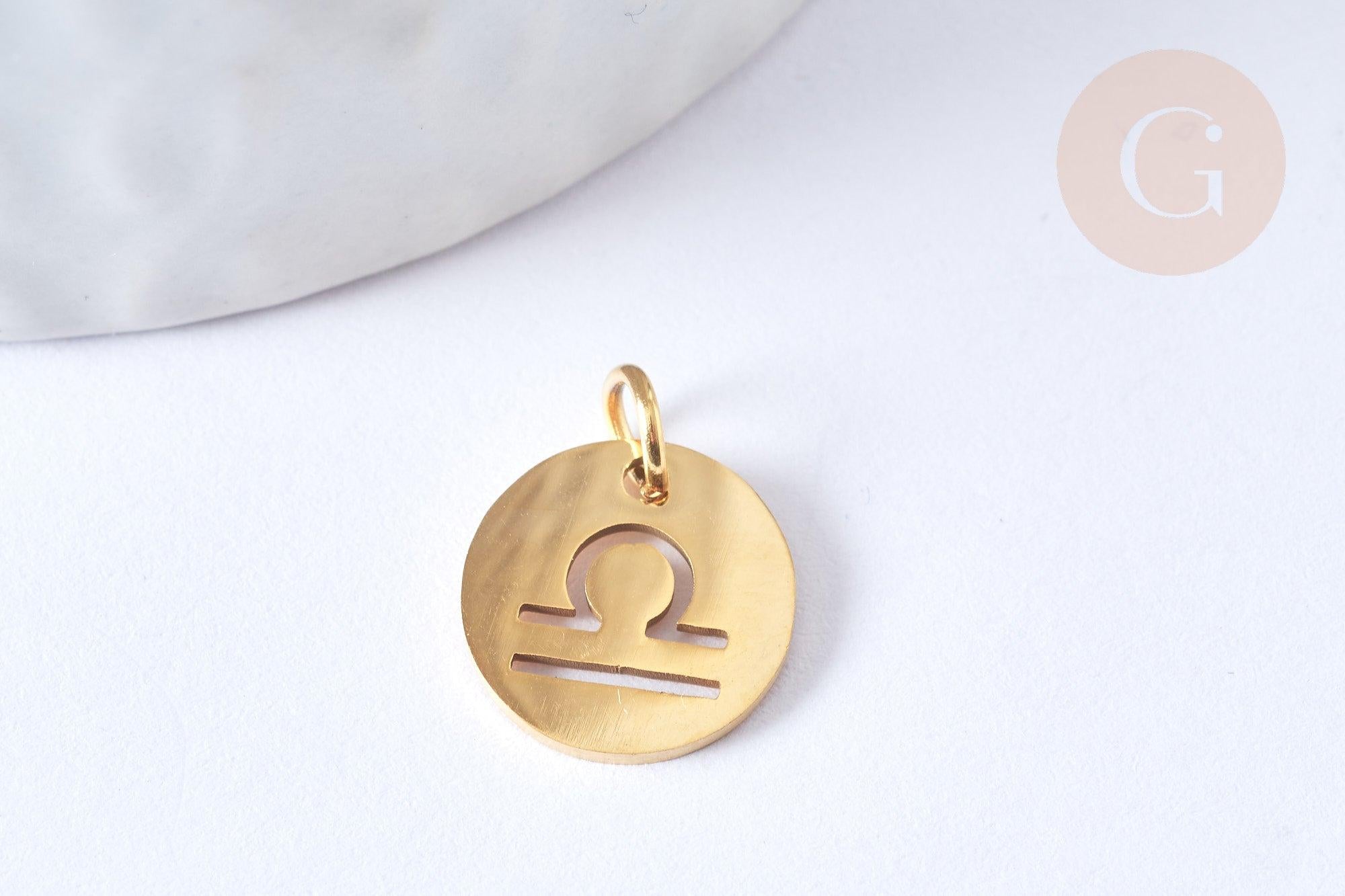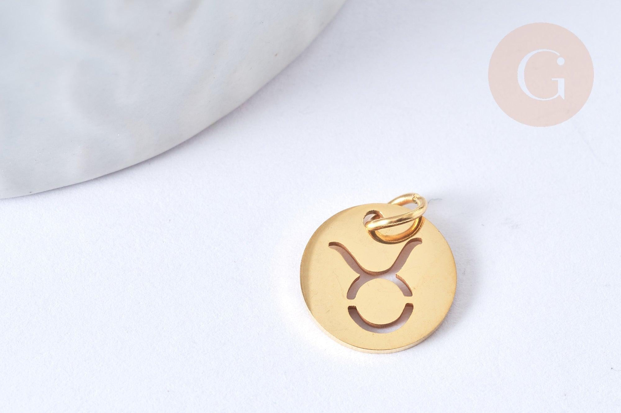 Déjese seducir por estos charms redondos calados de acero inoxidable 304 dorado que representan los signos astrológicos.