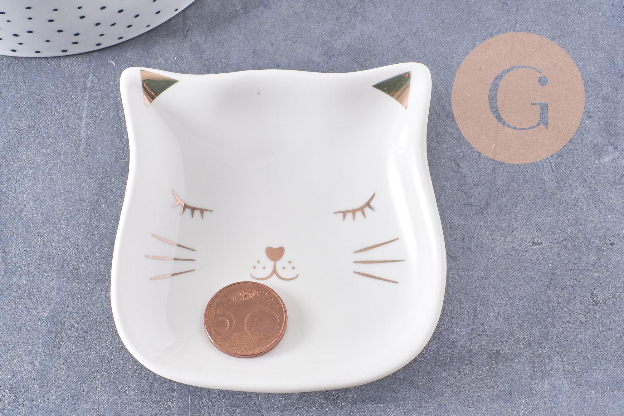 Plato de exhibición de joyas con forma de cabeza de gato de porcelana blanca y dorada de 85 mm (x1) (G10330)