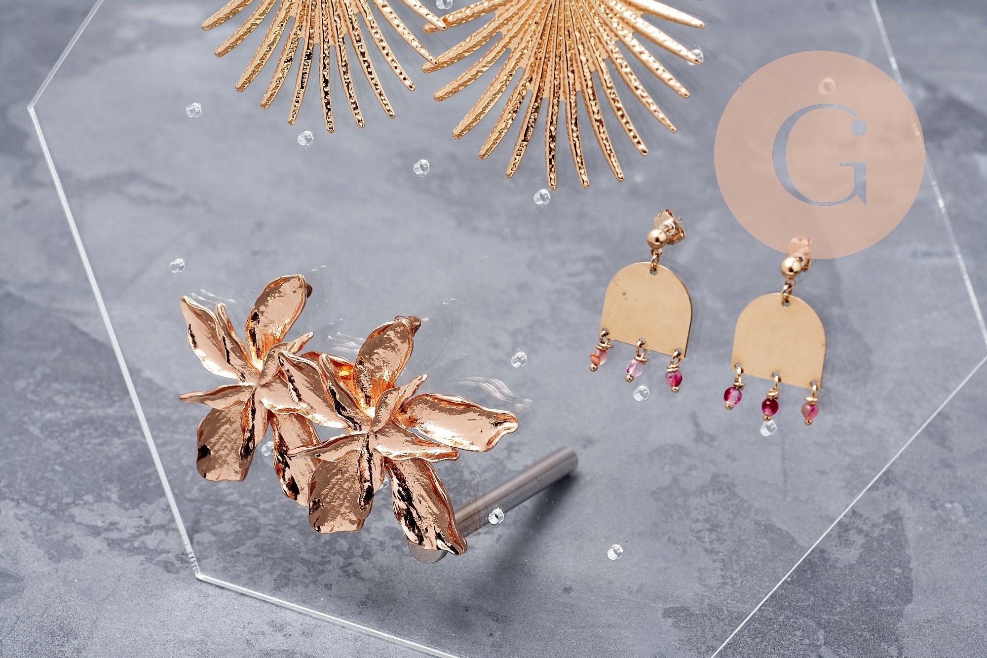 Muestra tus pendientes con estilo y originalidad gracias a este expositor de plexiglás con forma hexagonal, sobre base de latón bañado en oro.