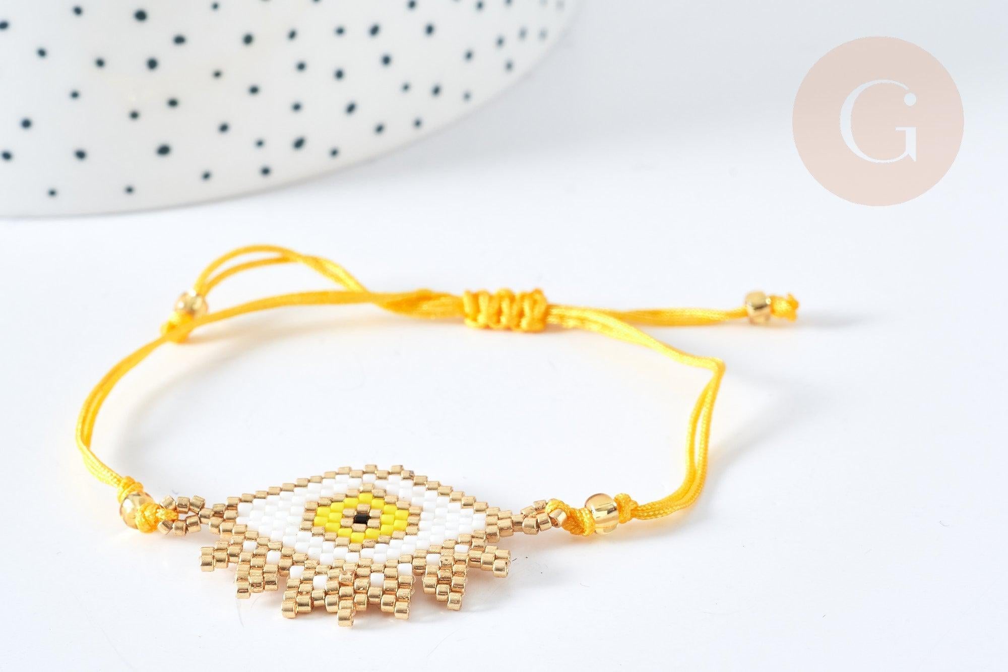 Bracelet Réglable losange mauvais œil jaune et or cordon nylon perles rocailles tissées 28cm, x1 (G7683)