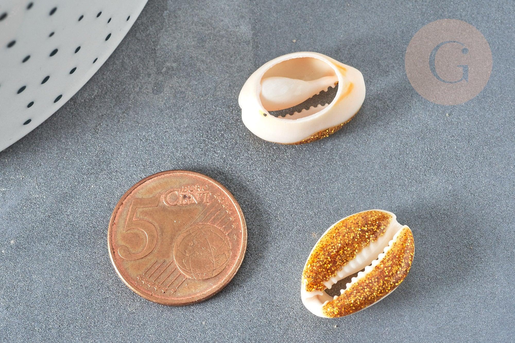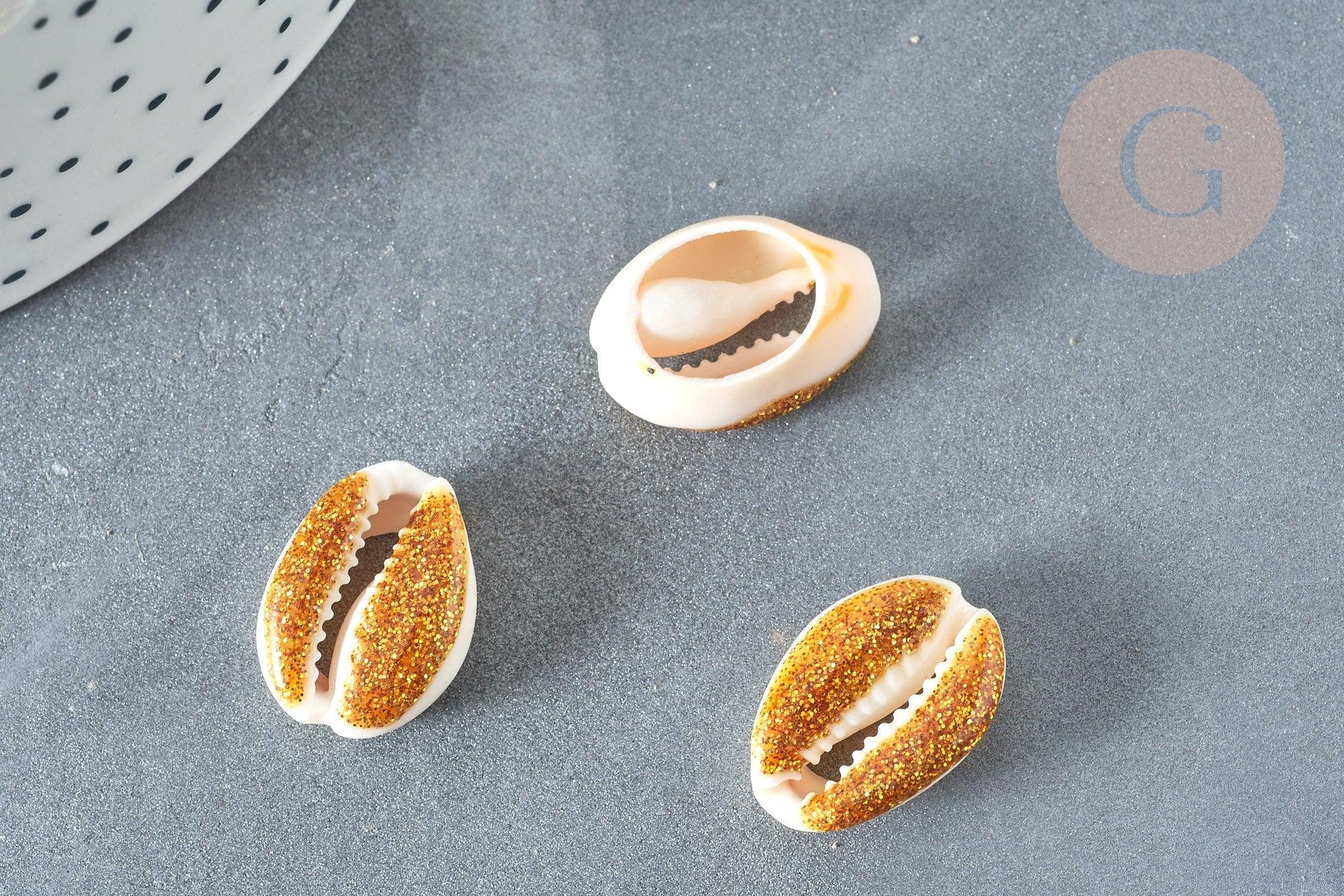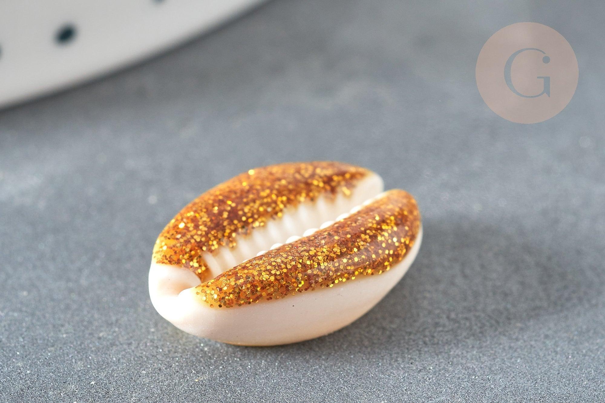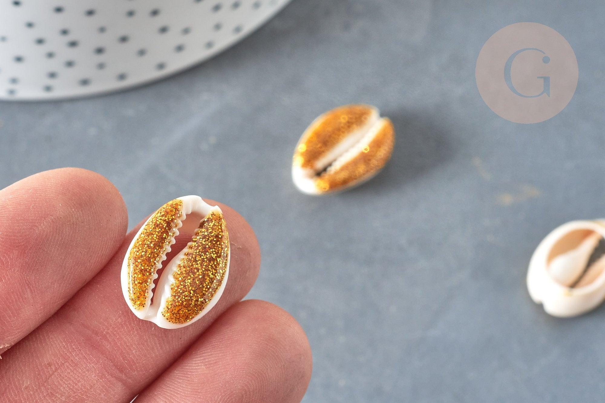 Este colgante es una concha de cauri real sin perforar, recubierta con resina epoxi con brillo dorado.