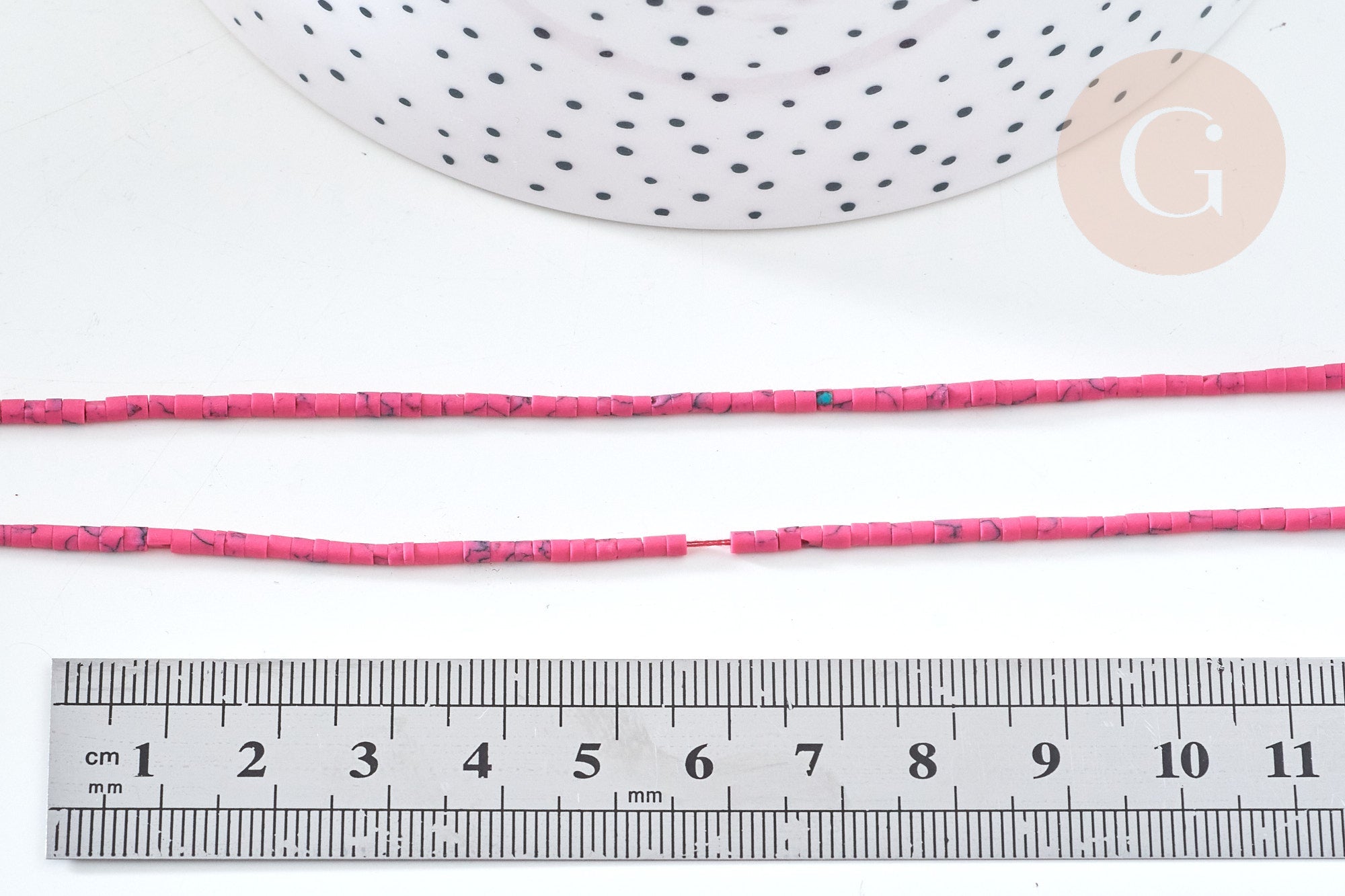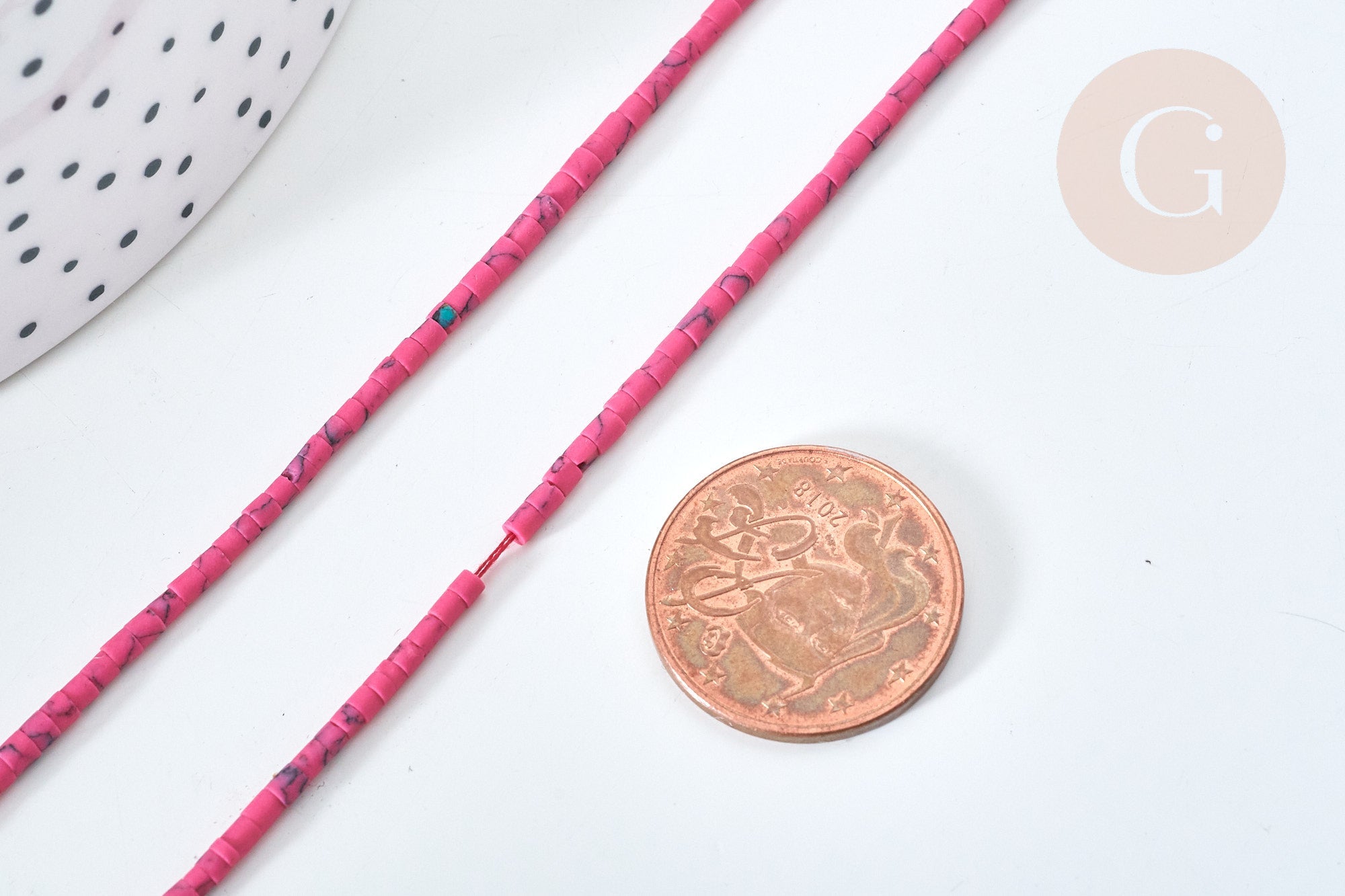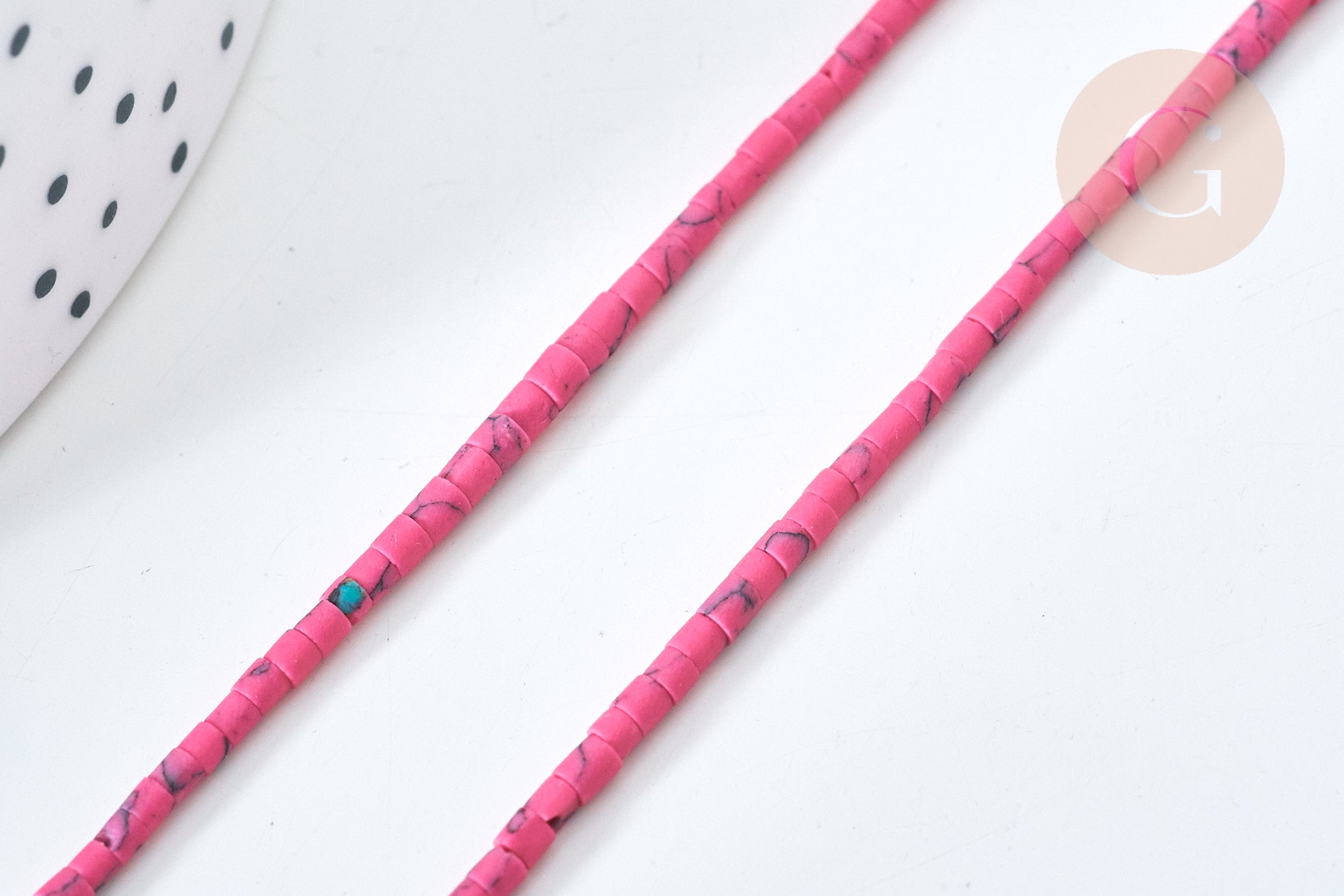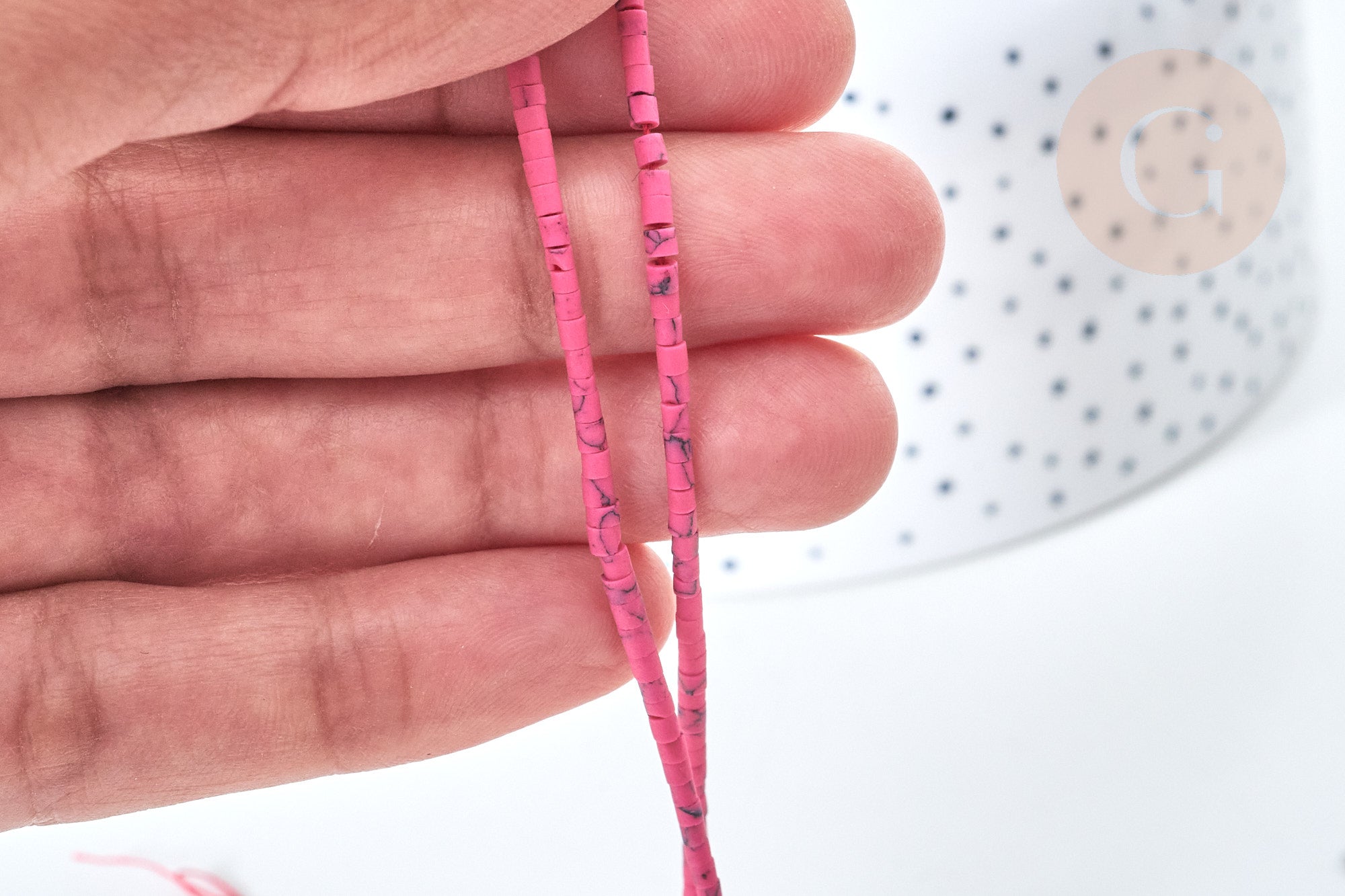 Una tira de cuentas heishi muy pequeñas en howlita natural teñida de rosa, para crear tus pendientes, collares y pulseras.