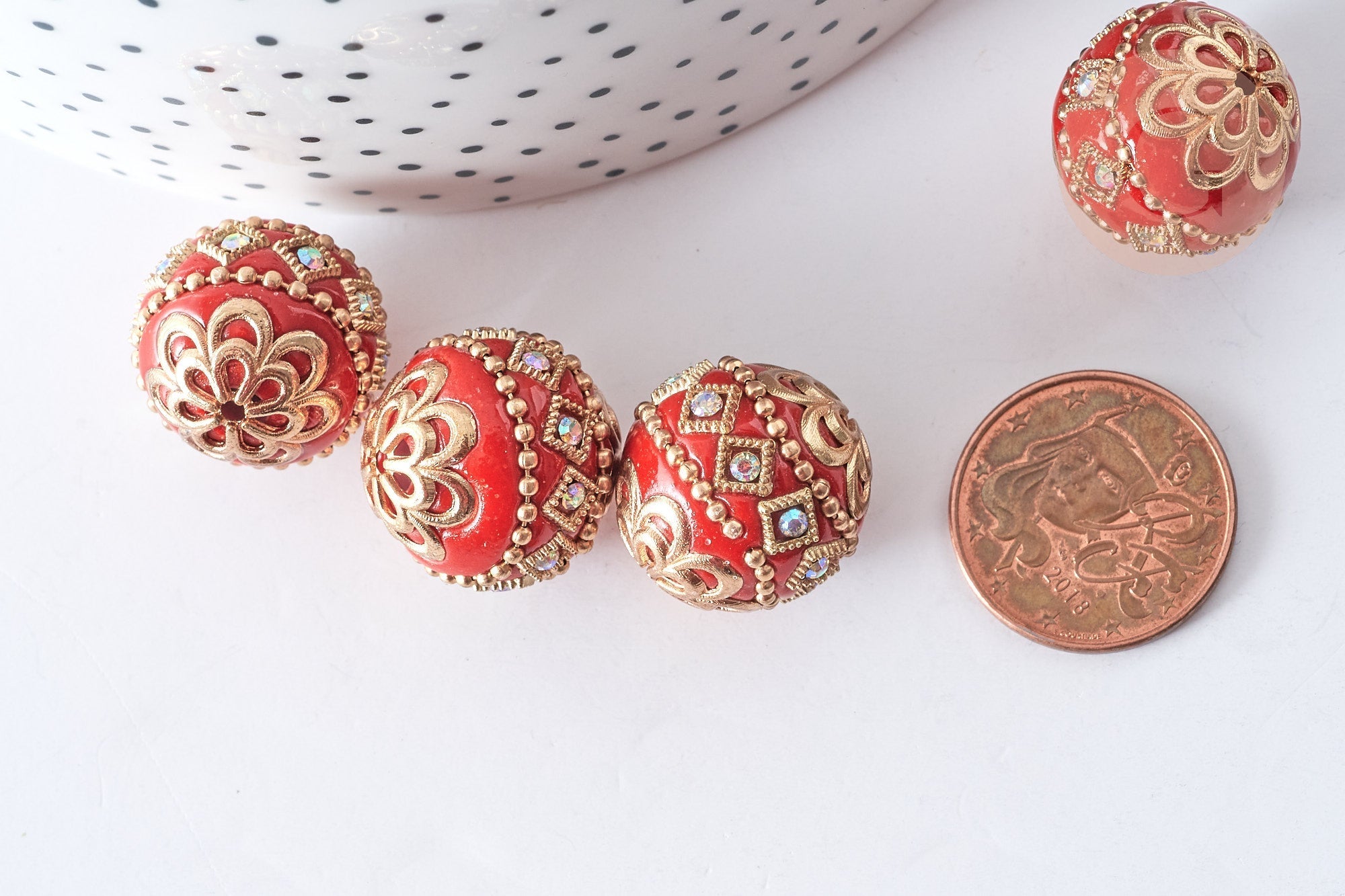 Magnífica cuenta de polímero rojo hecha a mano al estilo indonesio , con decoración de zamac dorado y pedrería.