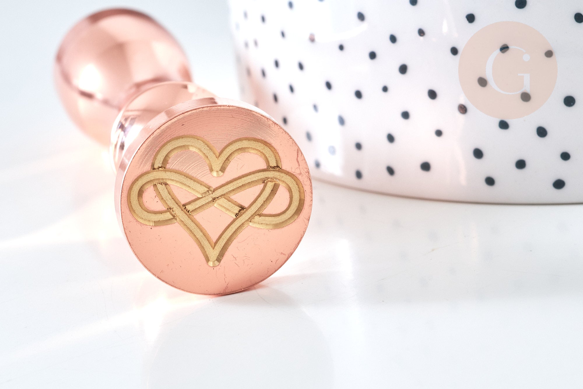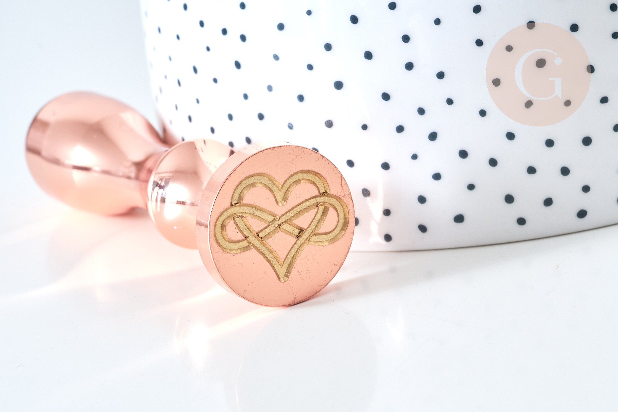 Un sello metálico con un corazón entrelazado del signo del infinito para lacrar, un suministro para crear sellos personalizados para tus invitaciones de boda DIY