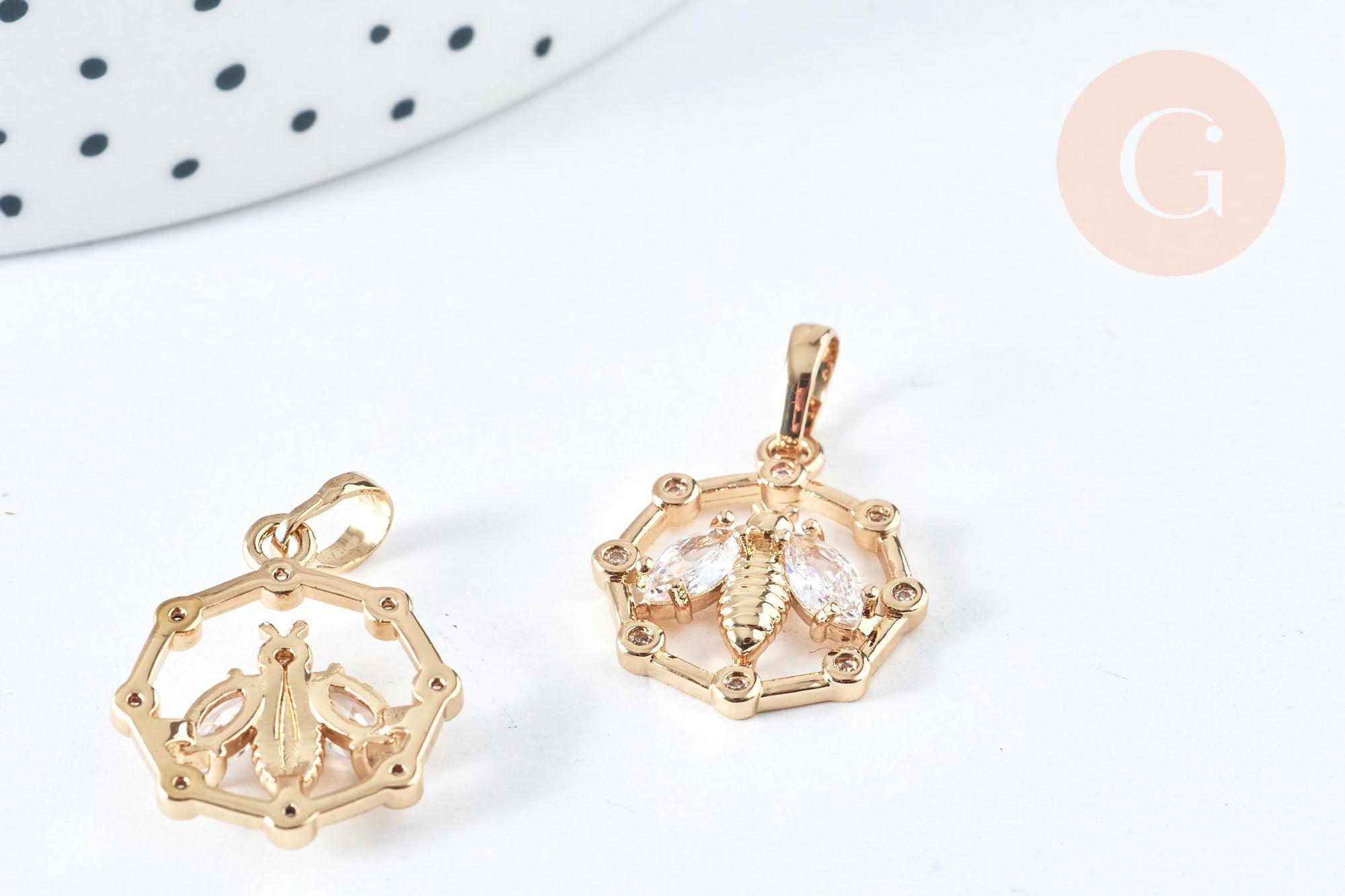 Colgante de medalla de abeja con circonitas de latón dorado de 18 mm, suministros de joyería, dije de latón y circonitas, x1 G6958