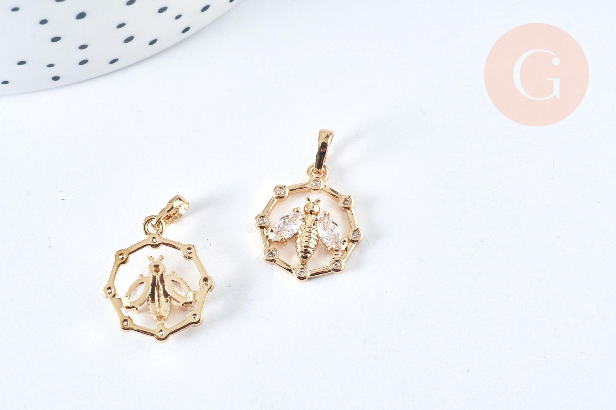 Pendentif médaille abeille zircon laiton doré 18mm, fournitures pour bijoux, breloque laiton et zircon, x1 G6958