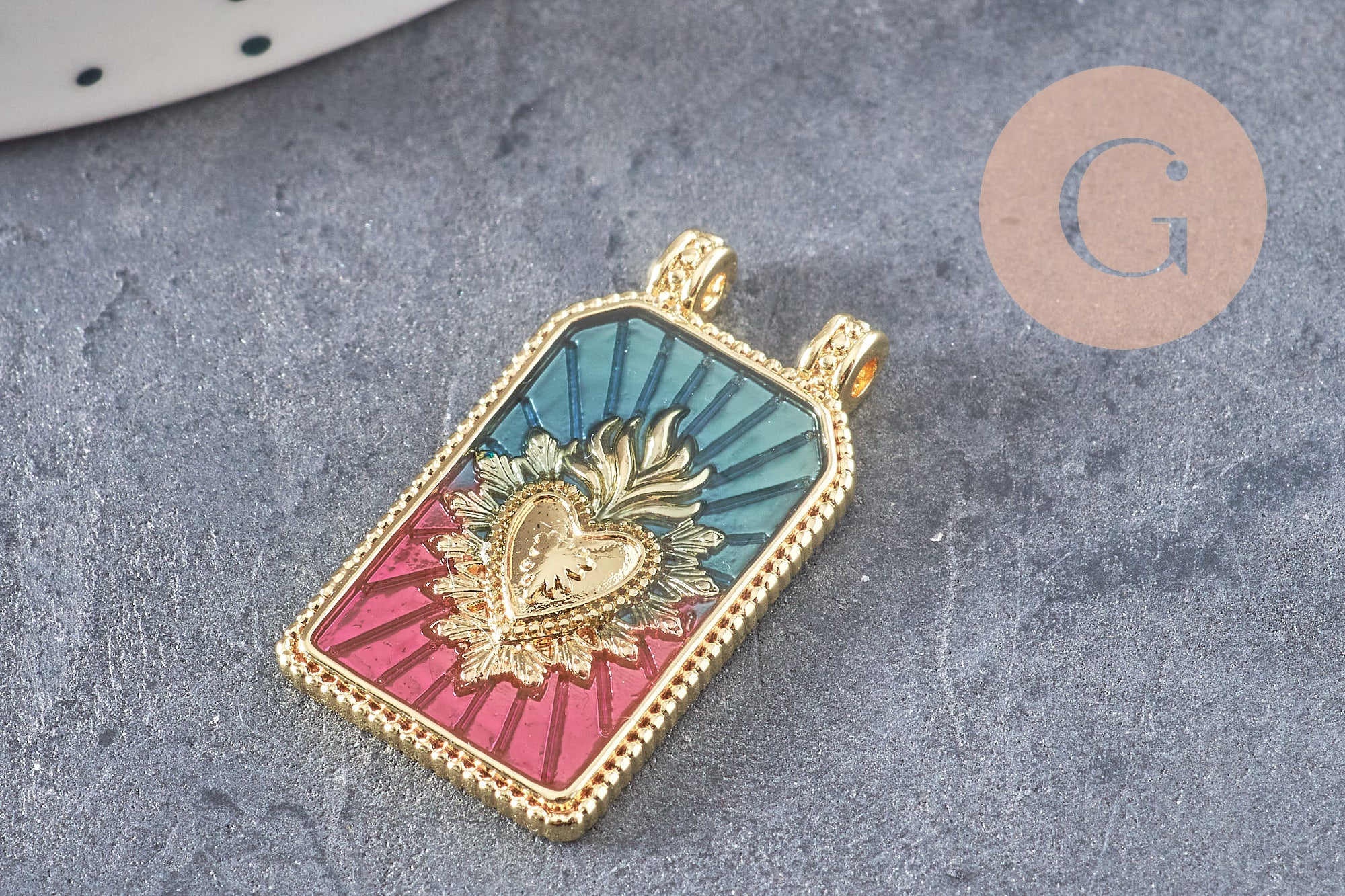 Dale un toque místico y colorido a tus creaciones con este colgante rectangular de latón bañado en oro de 18 quilates, adornado con un motivo de corazón sagrado esmaltado . Inspirada en talismanes espirituales, esta joya única y simbólica aportará carácter y profundidad a tus creaciones DIY.