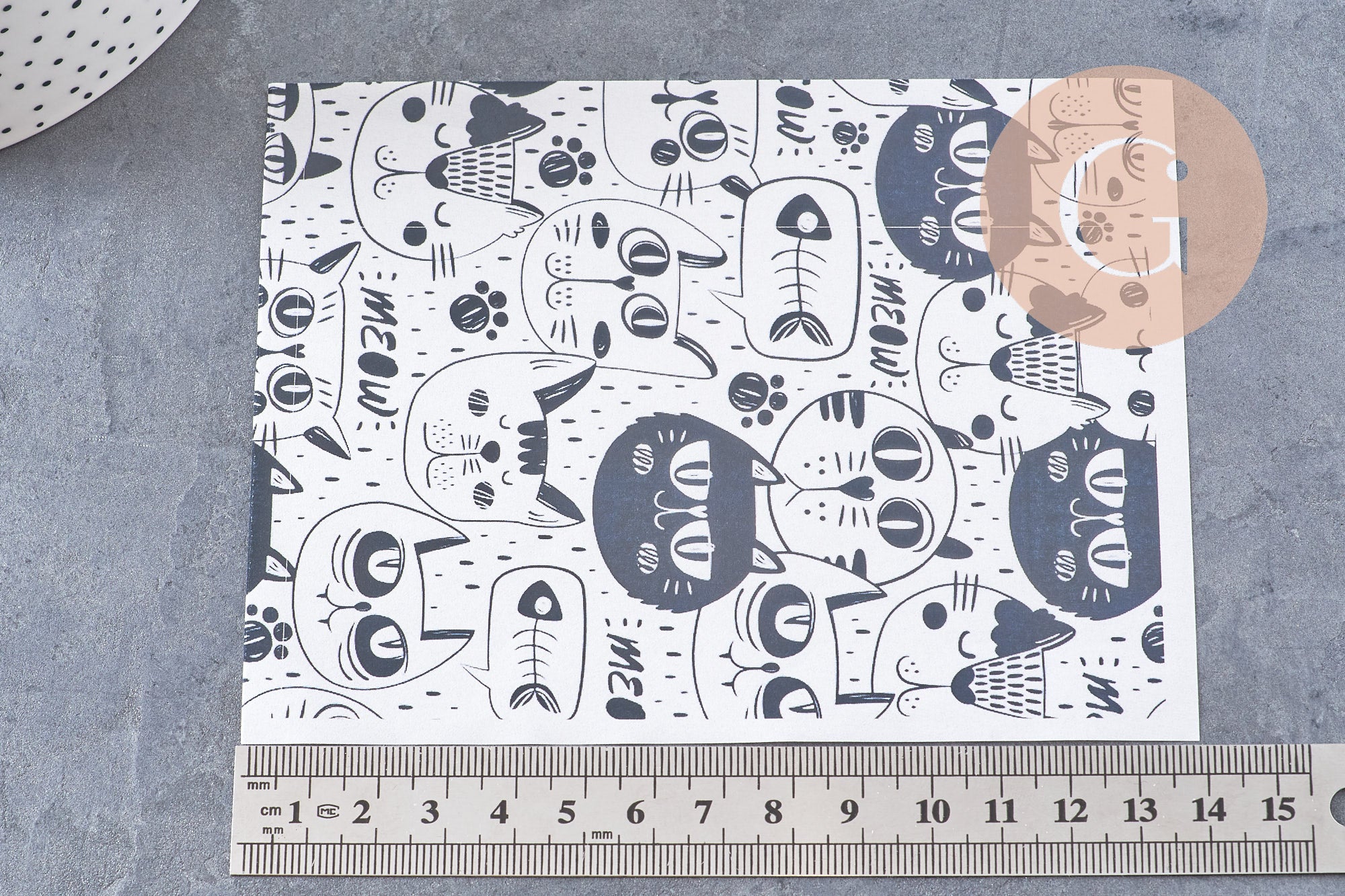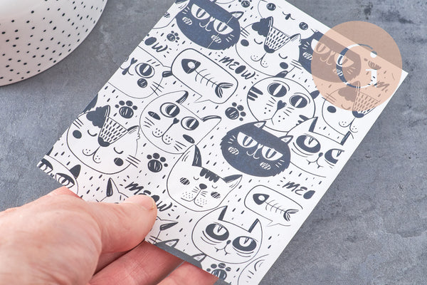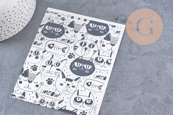 Dale un toque divertido y original a tus creaciones con esta lámina transferible de arcilla polimérica . Su divertido diseño de gatos, esqueletos de peces e inscripciones "MIAU" en blanco y negro es perfecto para crear bisutería original y divertida.