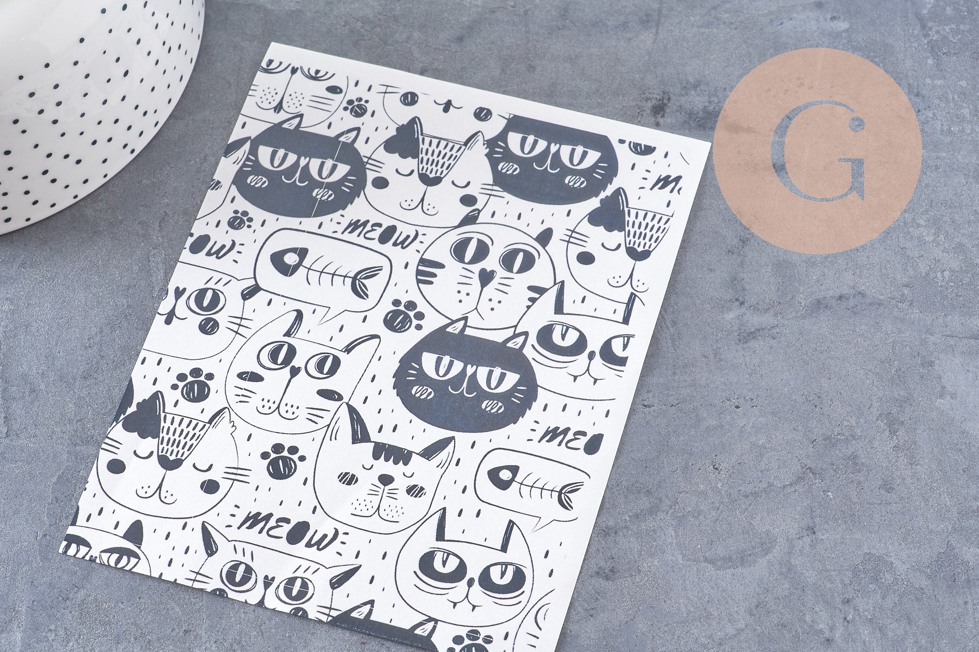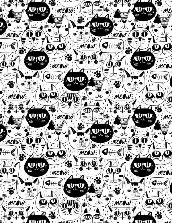 • Patrón: gatos, esqueletos de peces, texto “MIAU” (blanco y negro)