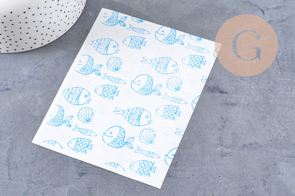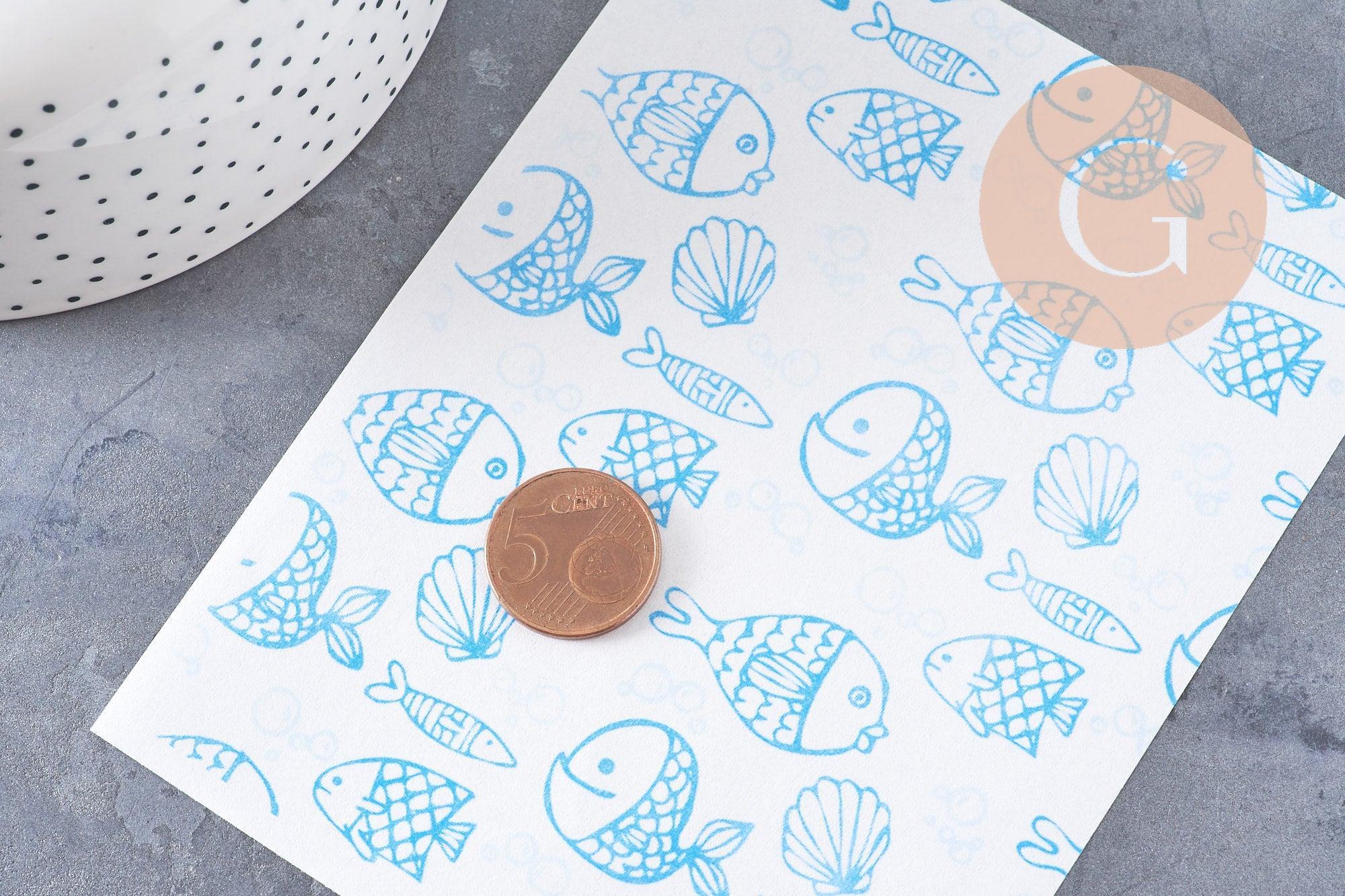 Feuille de transfert polymère – Gros poissons & coquillages turquoise 14x10 cm, x1 (G10773)