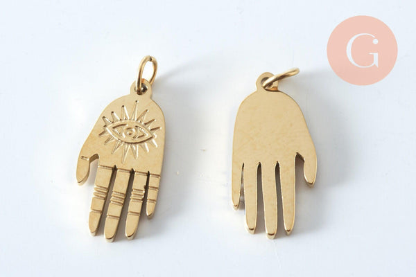To make magnificent necklaces, earrings and bracelets, adopt this hand of fatma engraved with a protective eye, small lucky pendant in stainless gold steel