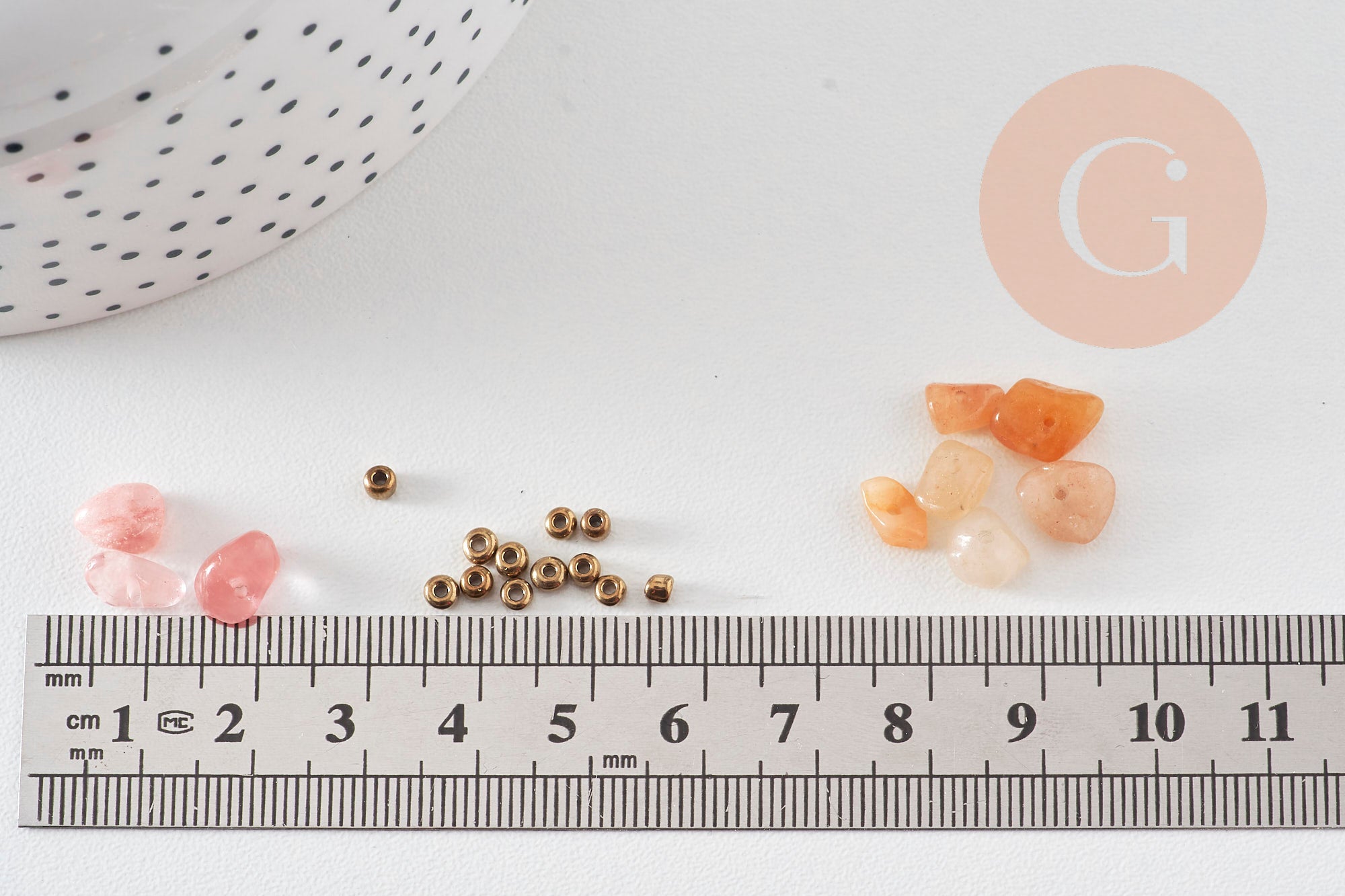 - 10 sets of gemstone beads: Dyed Howlite, Orange Agate, White Howlite, Rock Crystal, Yellow Quartz, Dyed Howlite, Tiger's Eye, Lapis Lazuli, Fluorite, Rose Quartz. Each set contains 10g of beads, approximately 30-45 beads.