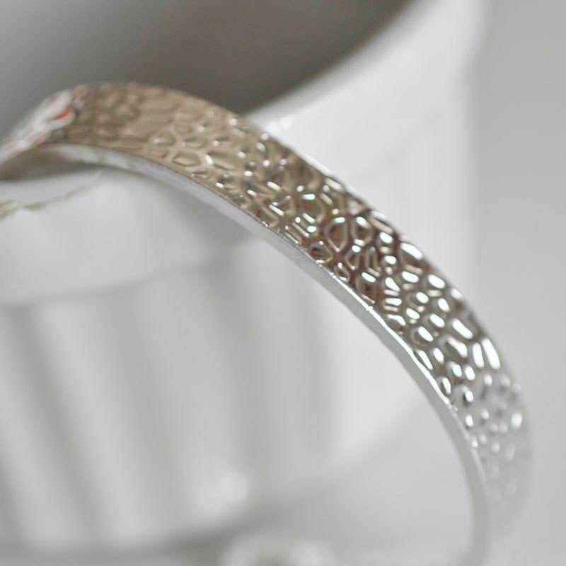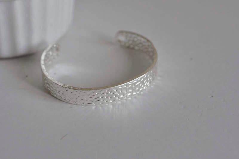 An original and timeless cuff bracelet, with a hammered texture pattern.