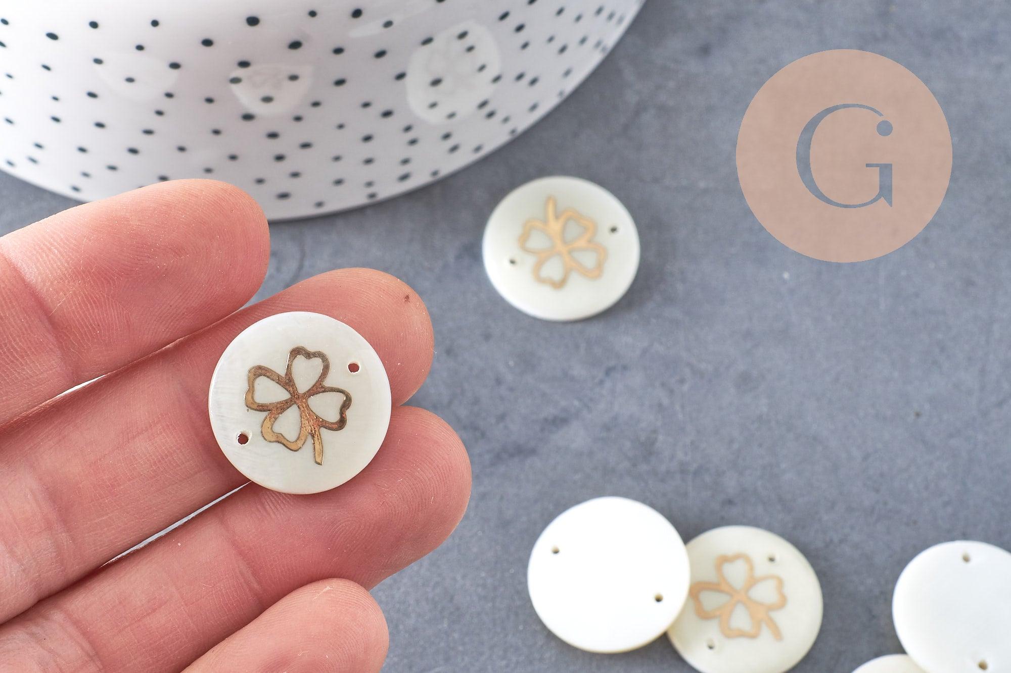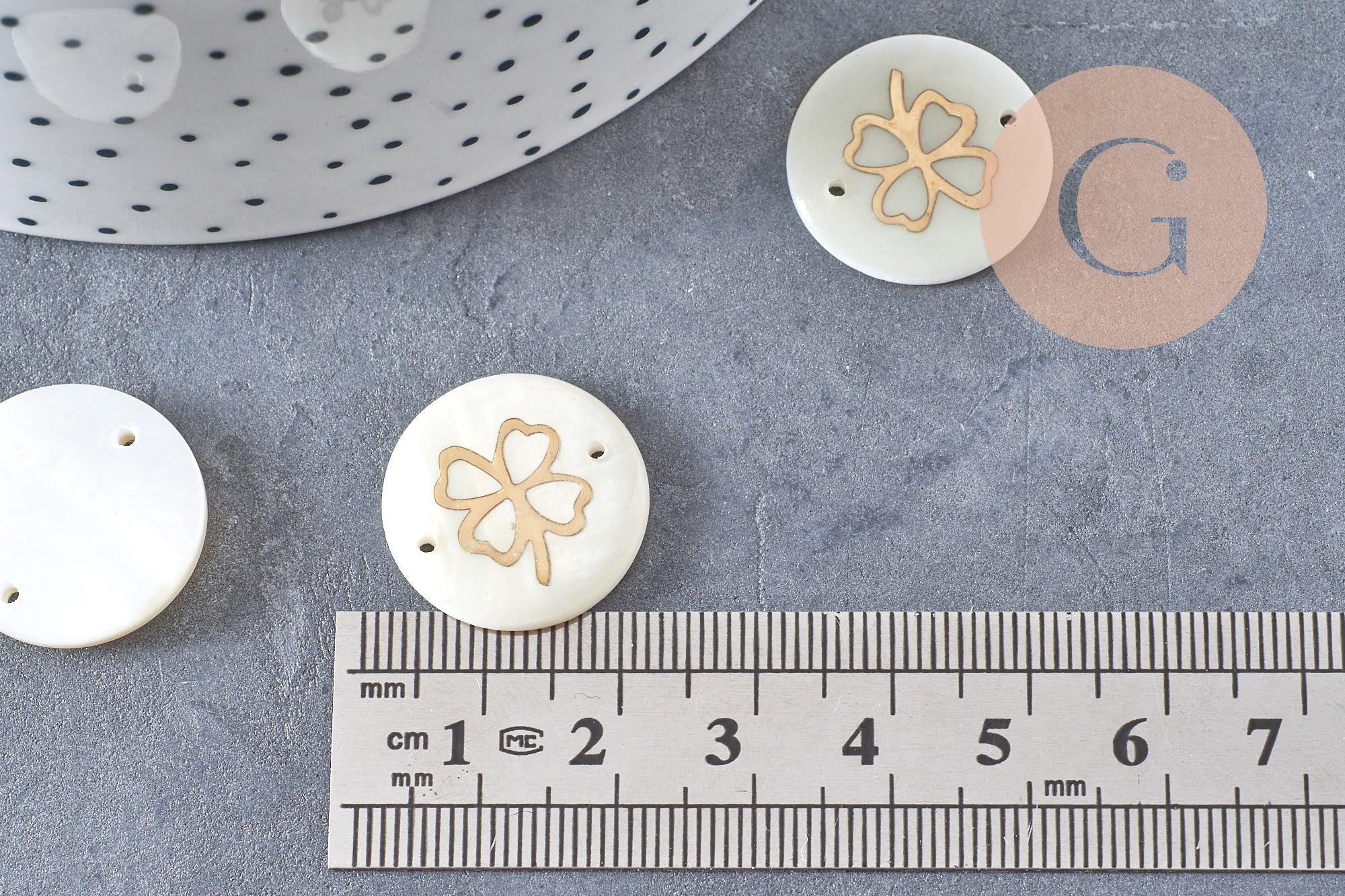 Round connector pendant in white mother-of-pearl with a golden motif of a four-leaf clover.