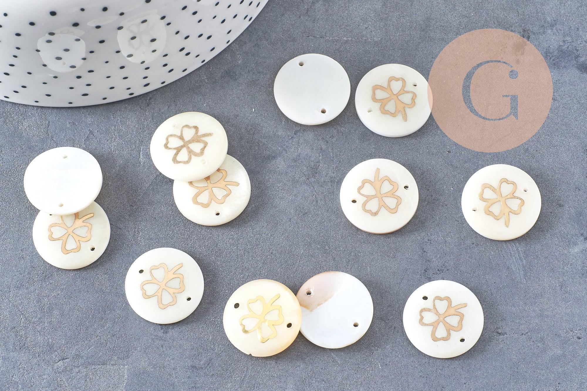 Pendentif rond nacre trèfle quatre feuilles 16mm, pendentif trèfle,coquillage blanc, coquillage naturel, x5 (G0915)