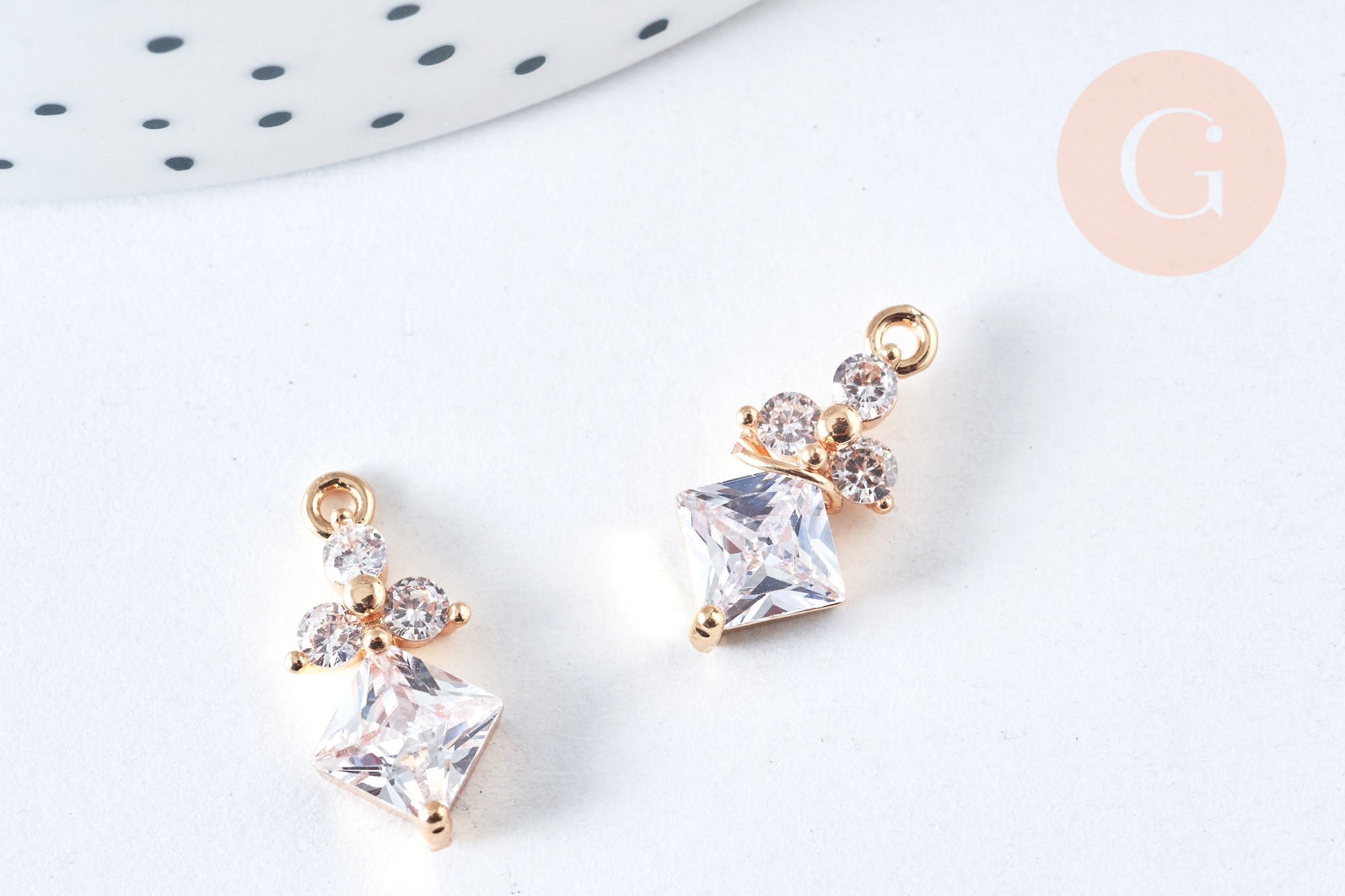Adopt this diamond-shaped charm in gold-plated brass set with 4 zircons (3 round and 1 diamond). Claw setting to reveal the shine of the zirconiums.