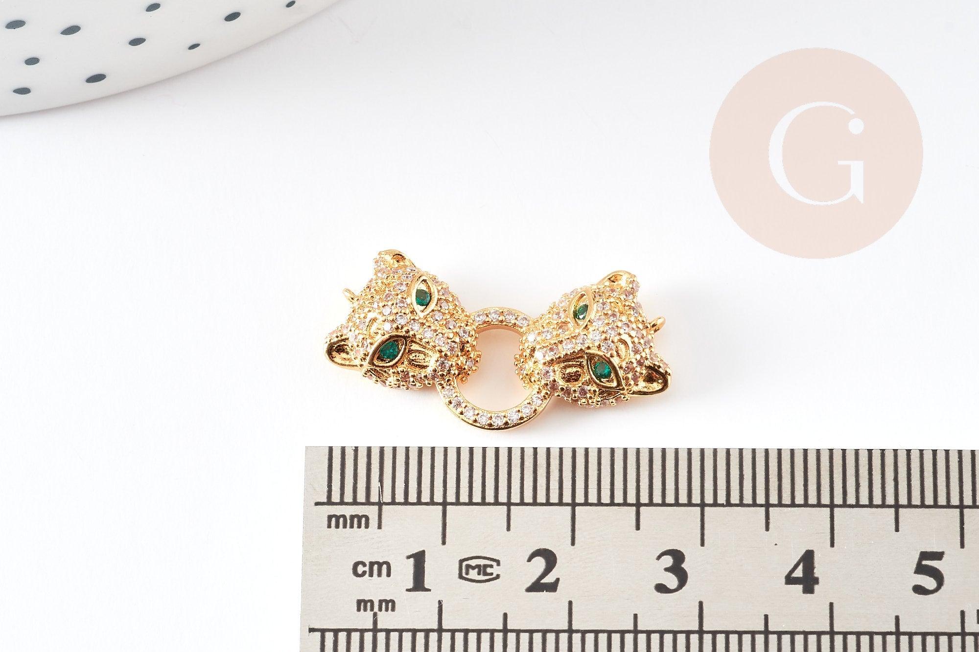 A leopard connector in 18K gold-plated brass and sparkling zircons , an ideal central element for your DIY creations . This luminous feline motif will add a touch of character to your necklaces, bracelets or long necklaces. Its manufacturing quality and bold style adapt perfectly to gold or gemstone jewelry.
