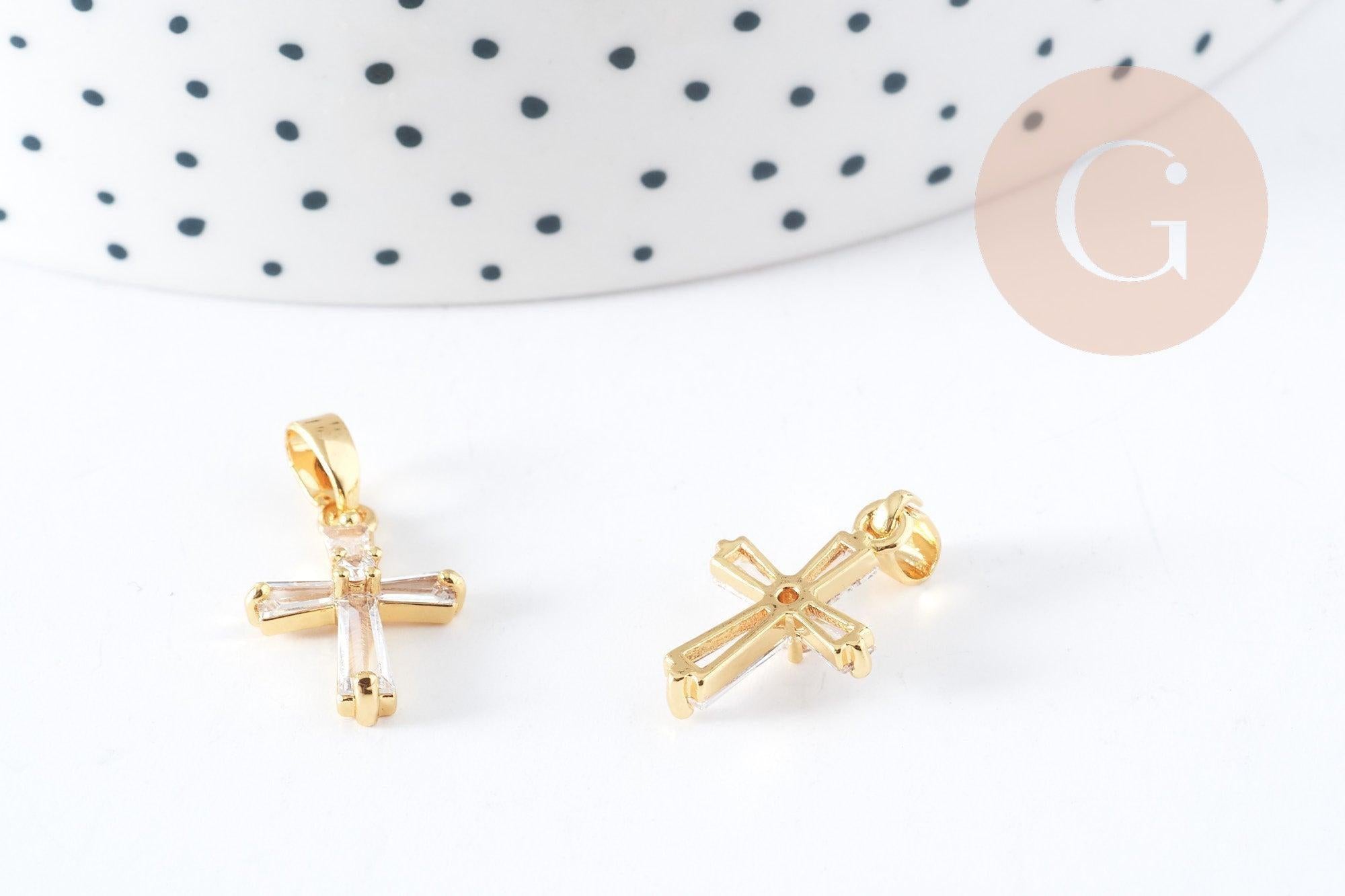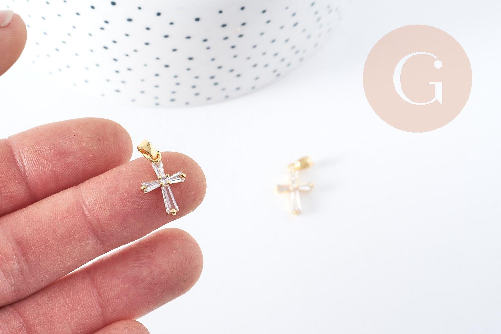 An elegant cross in 18k gold-plated brass covered with faceted, transparent white zircons . Please note: the pattern is present on one side.