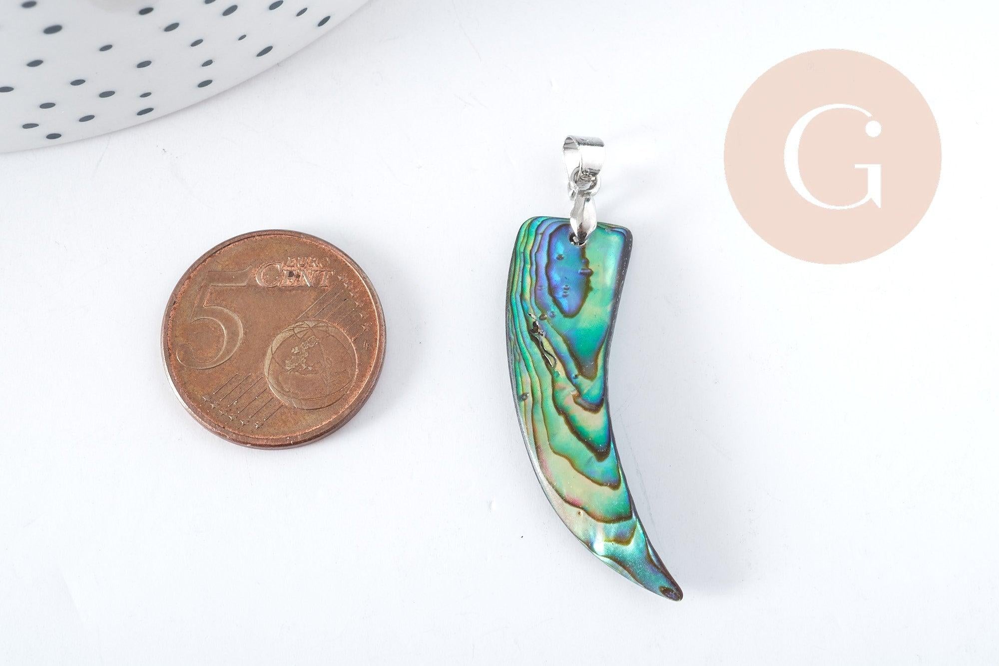 This unique tooth-shaped pendant , made from natural black abalone mother-of-pearl, is a truly exceptional piece of jewelry.