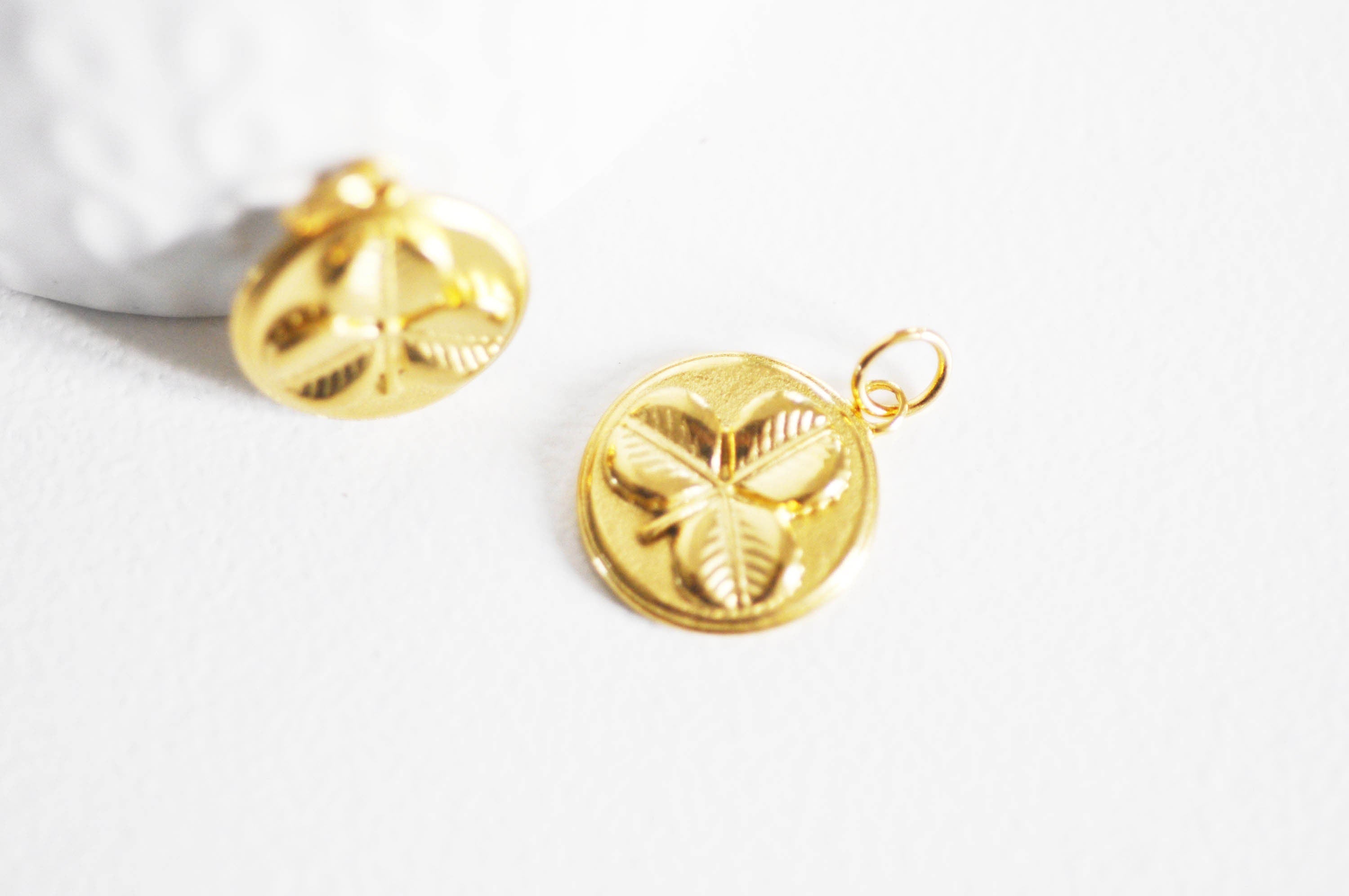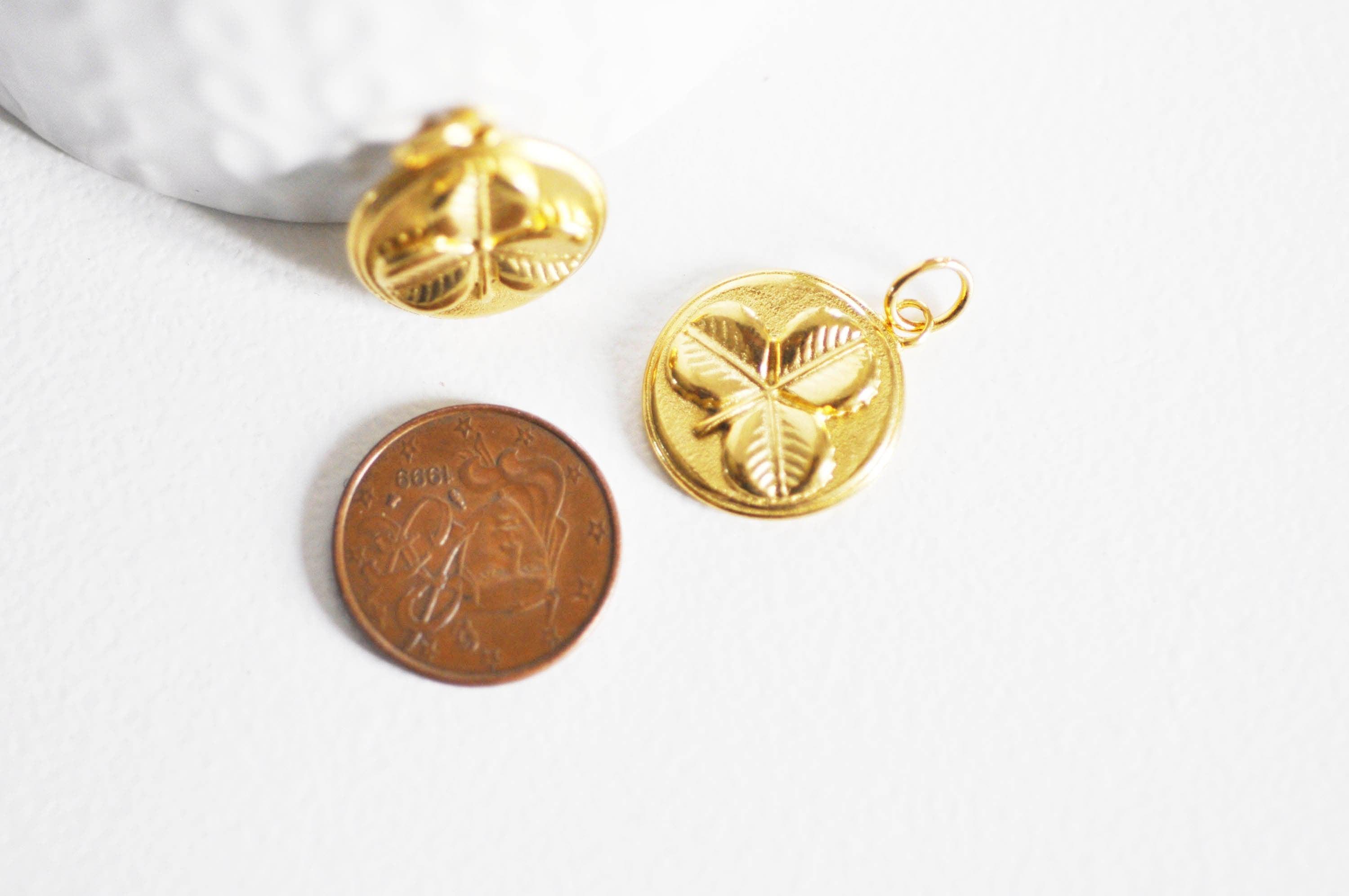Round golden steel clover medal pendant, creative supplies, golden pendant, nickel-free, golden brass, jewelry creation, gold medal, 2.3cm A pretty golden medal representing a 3-leaf clover. Dimensions: Length: 23mm Width: 19.5mm Thickness: 3.5mm Hole: 5mm. Guaranteed nickel-free, cadmium-free and lead-free...
