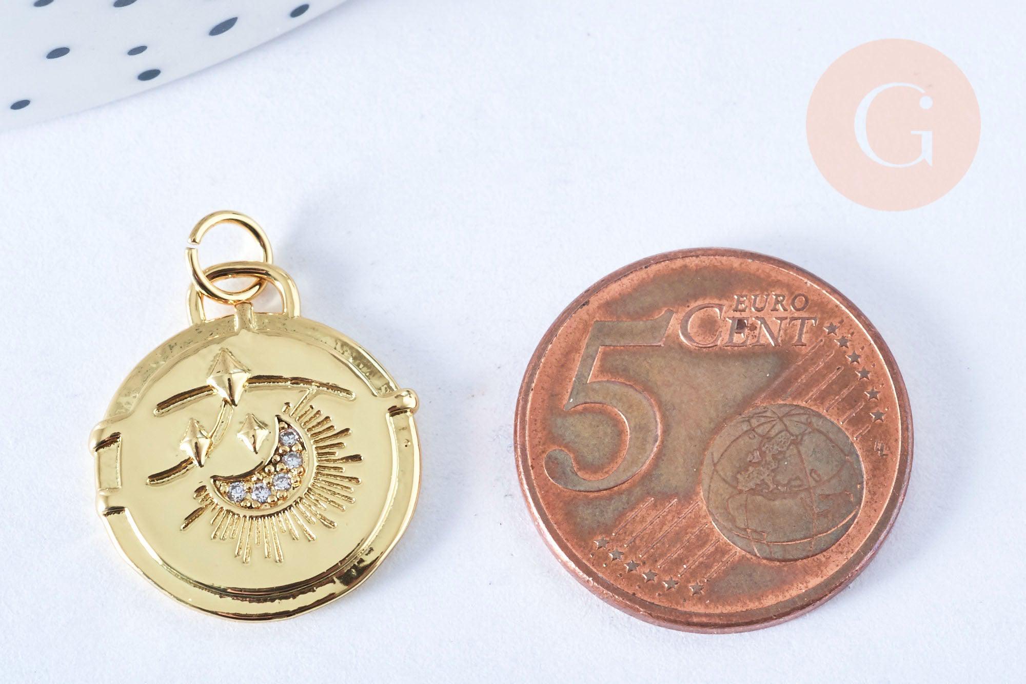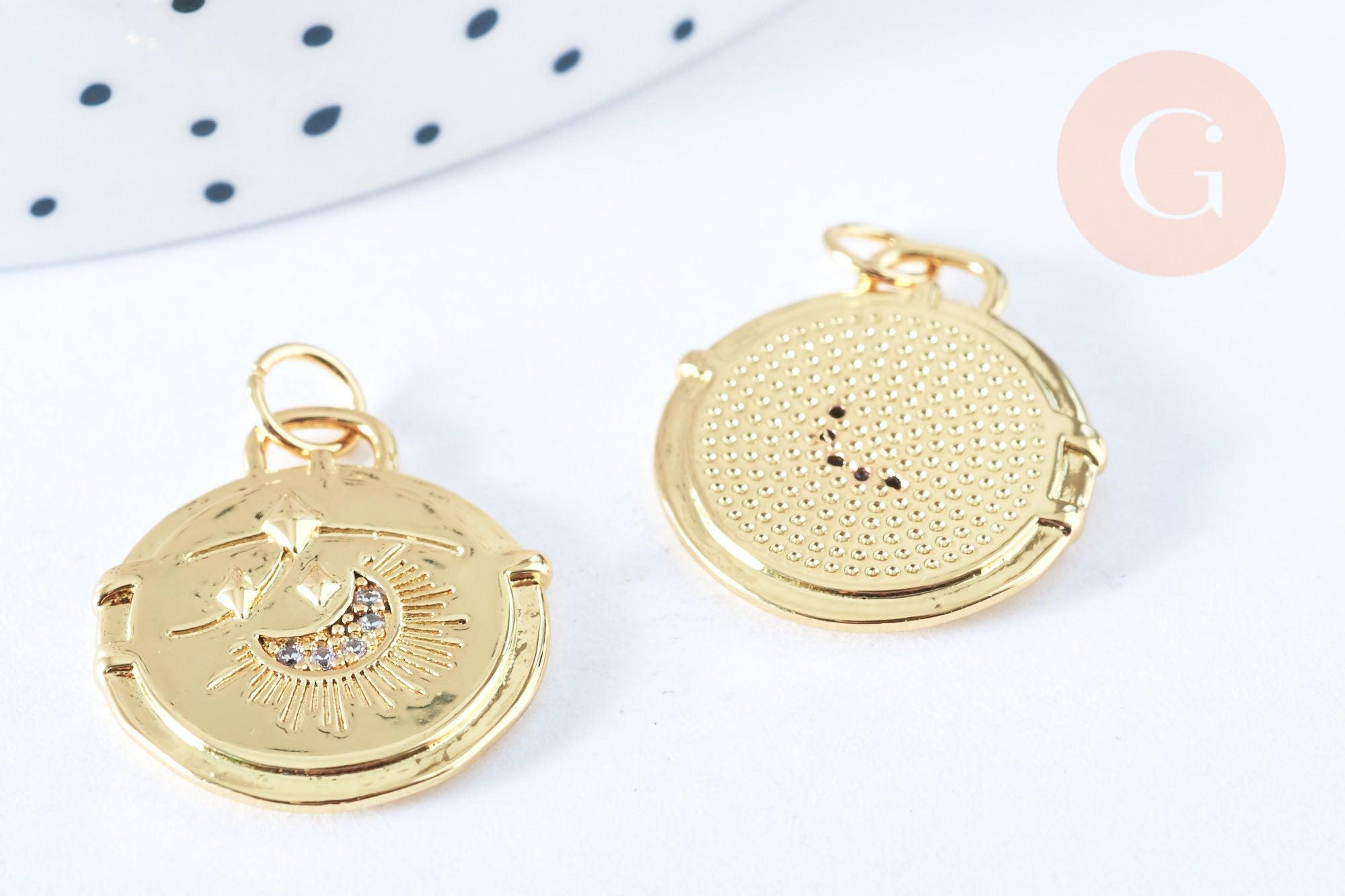 To make magnificent necklaces and earrings, this adorable round lucky medal in 18K gold-plated brass enamel, decorated with a mystical moon and a zircon crystal.