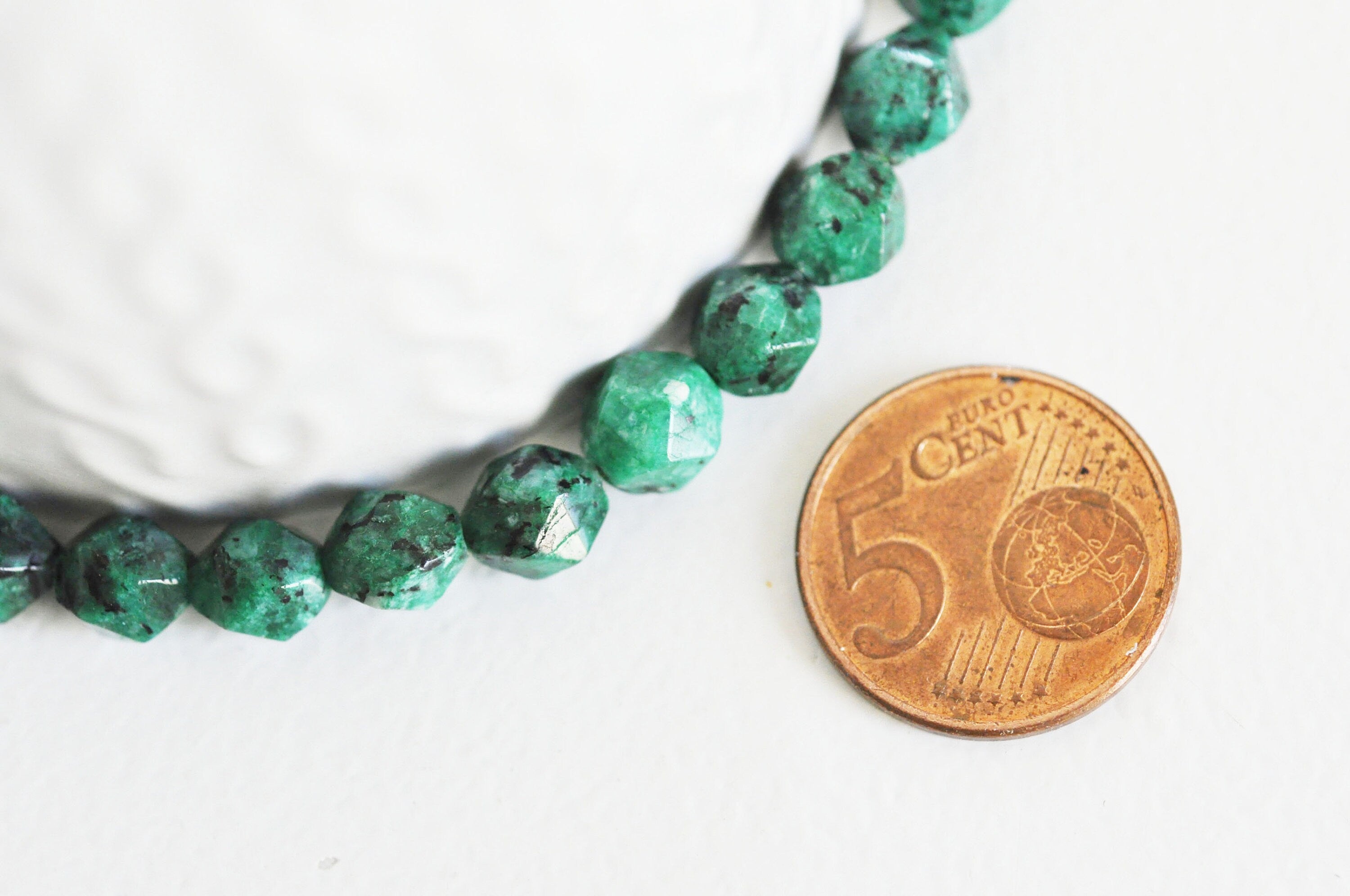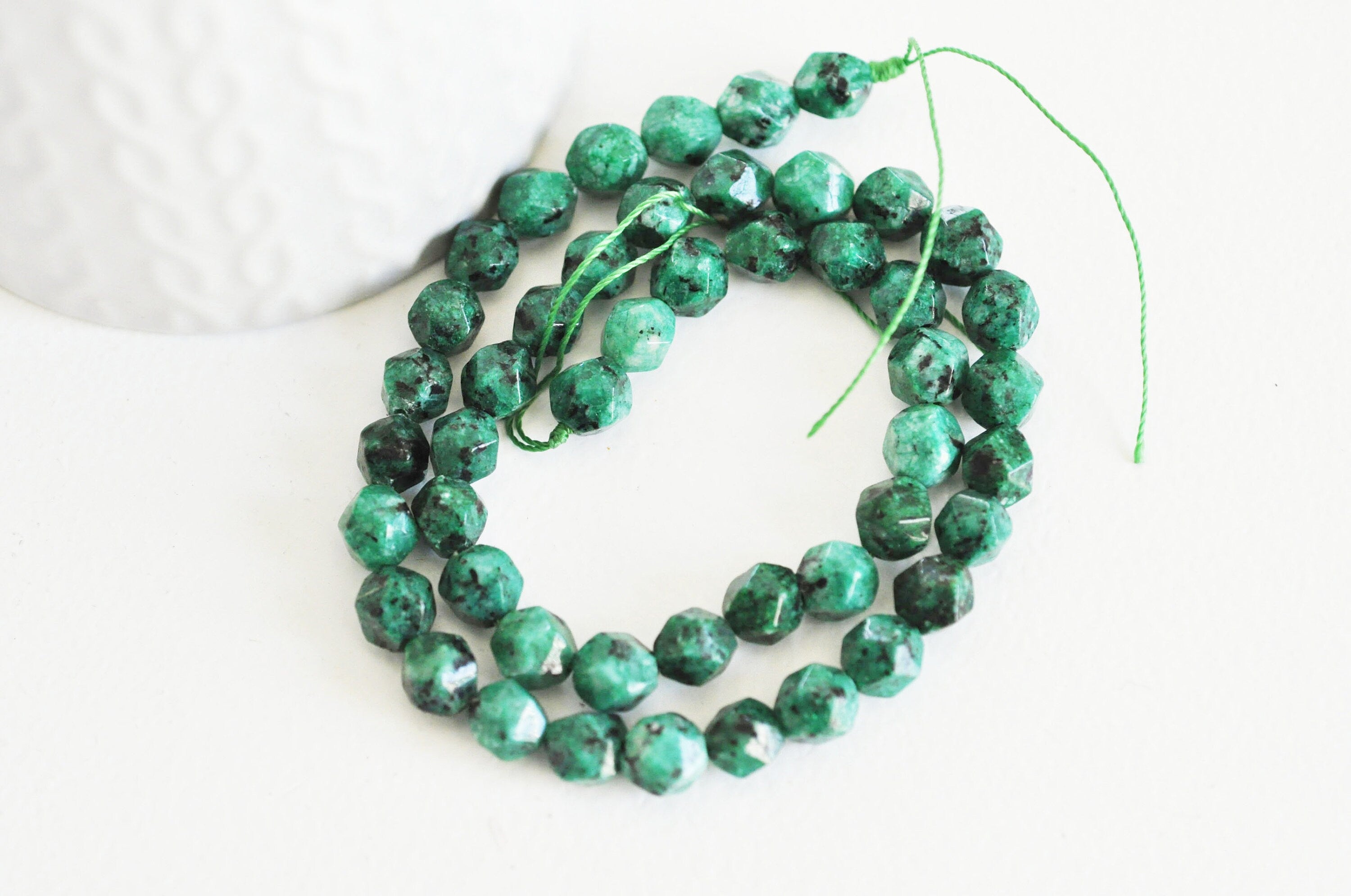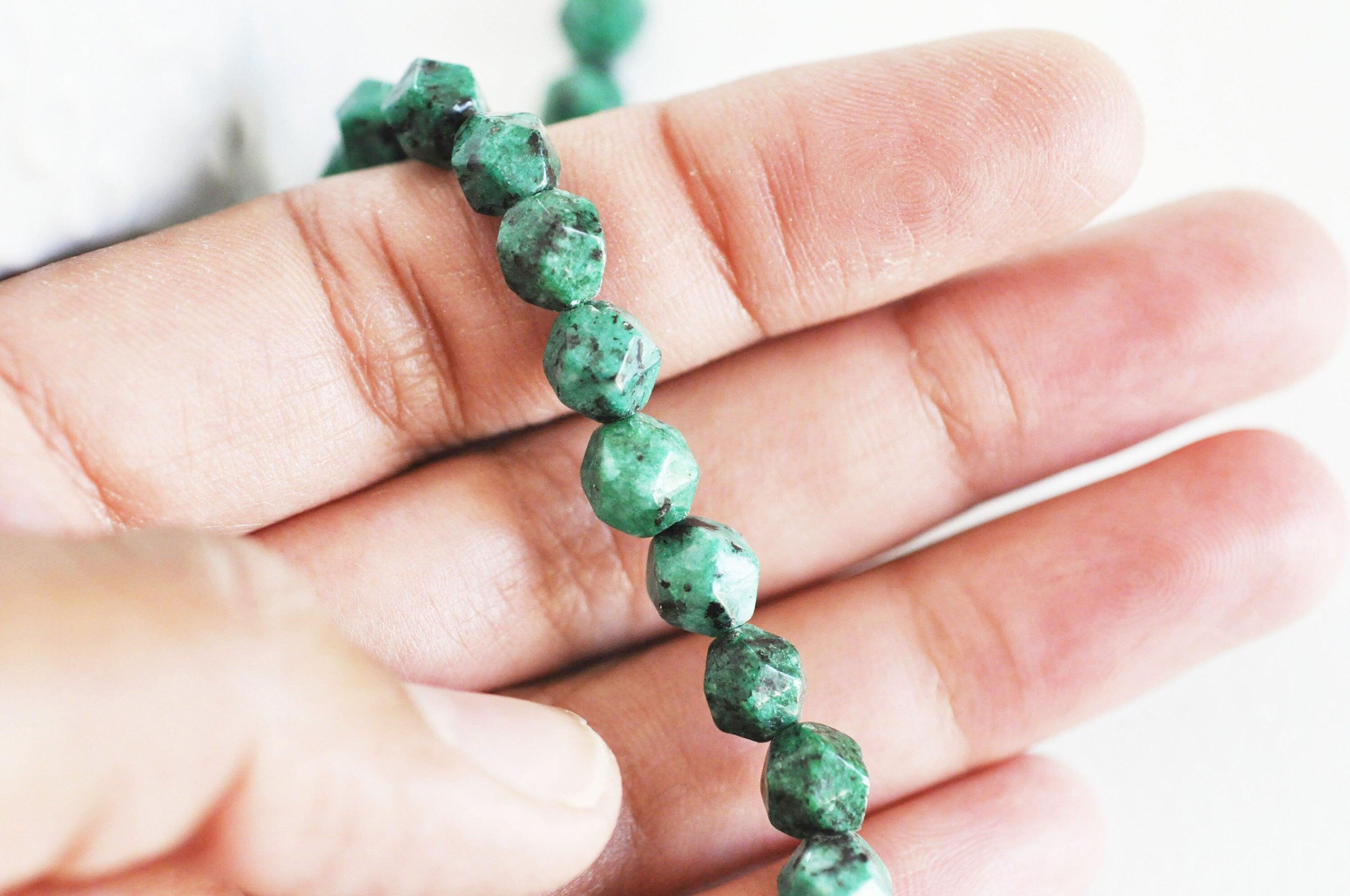 Beads made from natural green-tinted Sesame Kiwi Jasper stone, for creating original stone jewelry. The pearls measure 8.5mm on each side Hole: 0.5mm Sold by the strand of approximately 45 beads Other natural stone beads are available in the gingerlily...