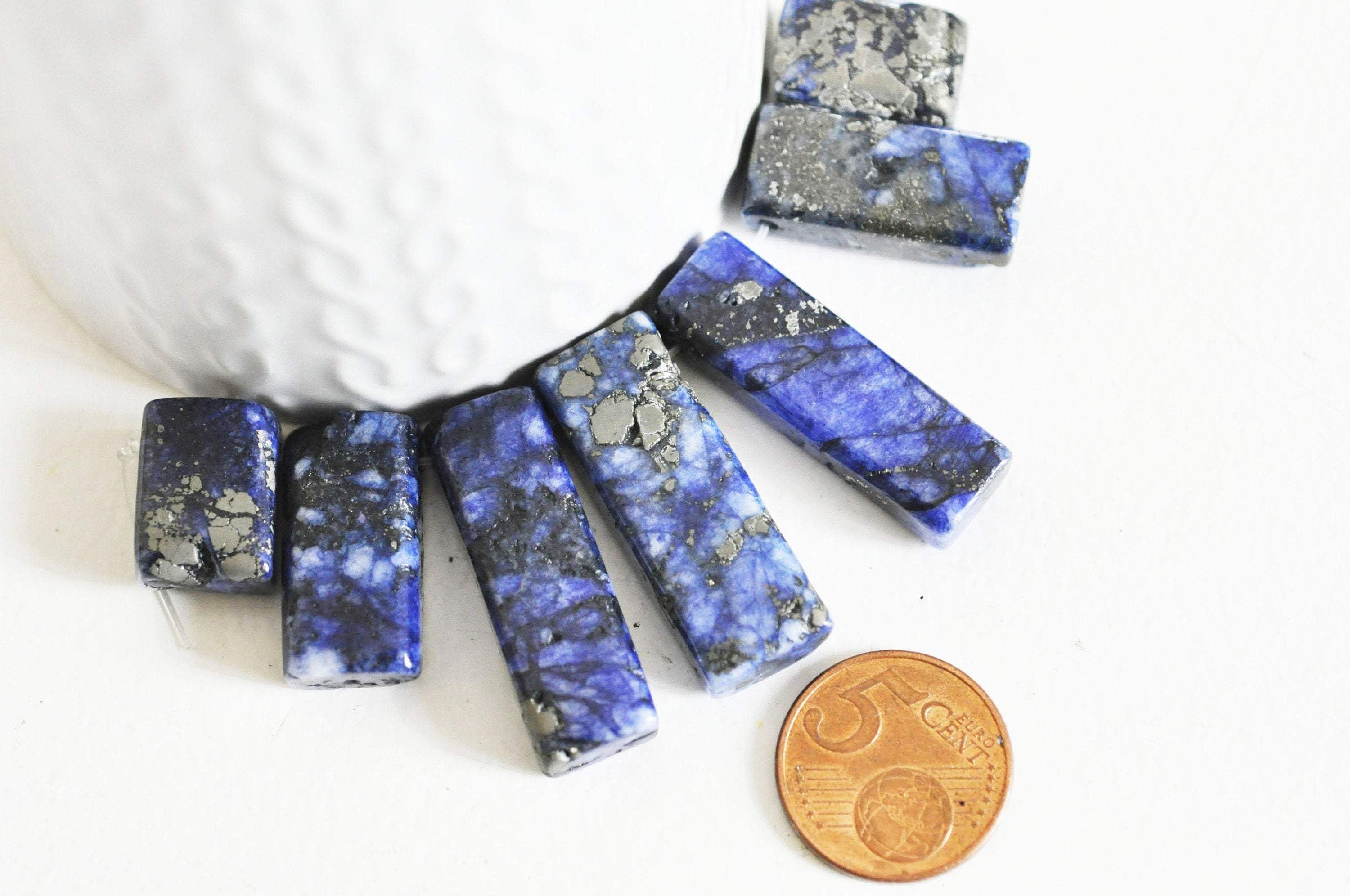 Fall for this set of 7 rectangular beads in natural, tinted and drilled lapis lazuli; The sizes are increasing so that they can be used on a necklace, for example. You can use it as a pendant to make very...
