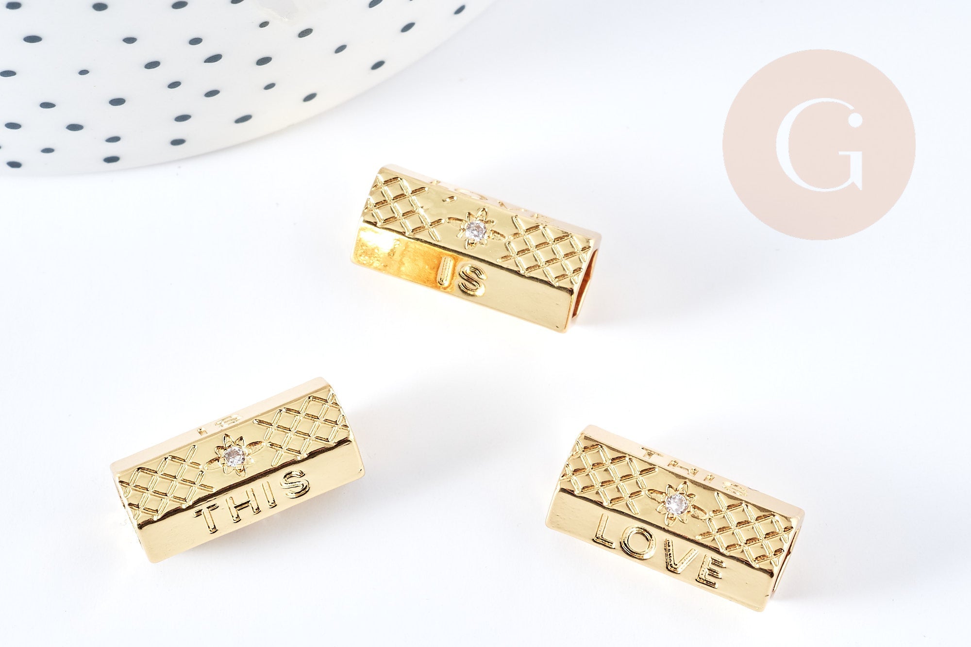 Perle tube talisman message THIS IS LOVE cristal laiton doré 21mm, perle dorée bijoux chance, x1 G7673