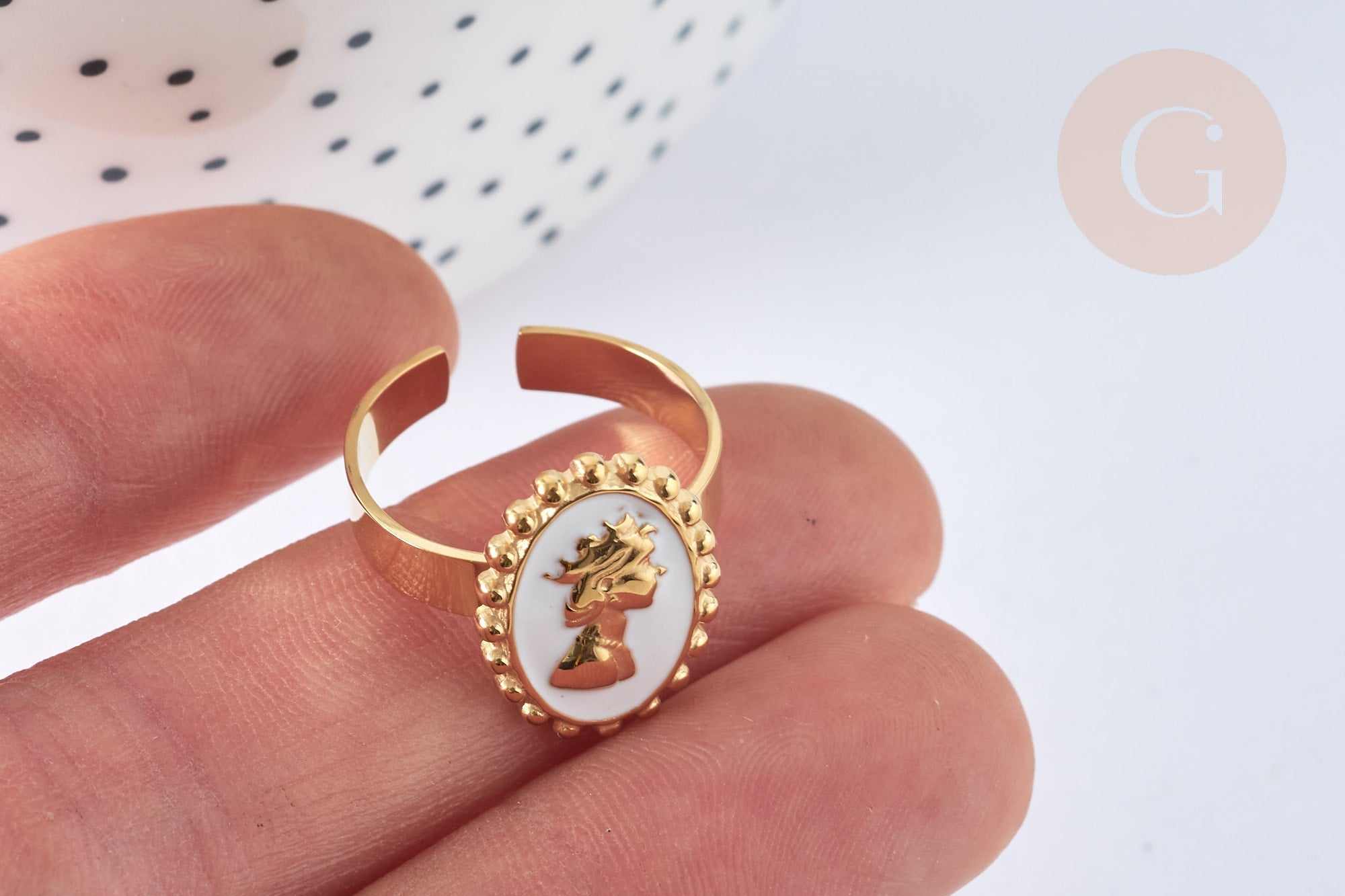 A cameo ring enameled with white resin, adjustable in stainless steel . A delicate and old-fashioned jewel, which will accompany you every day.