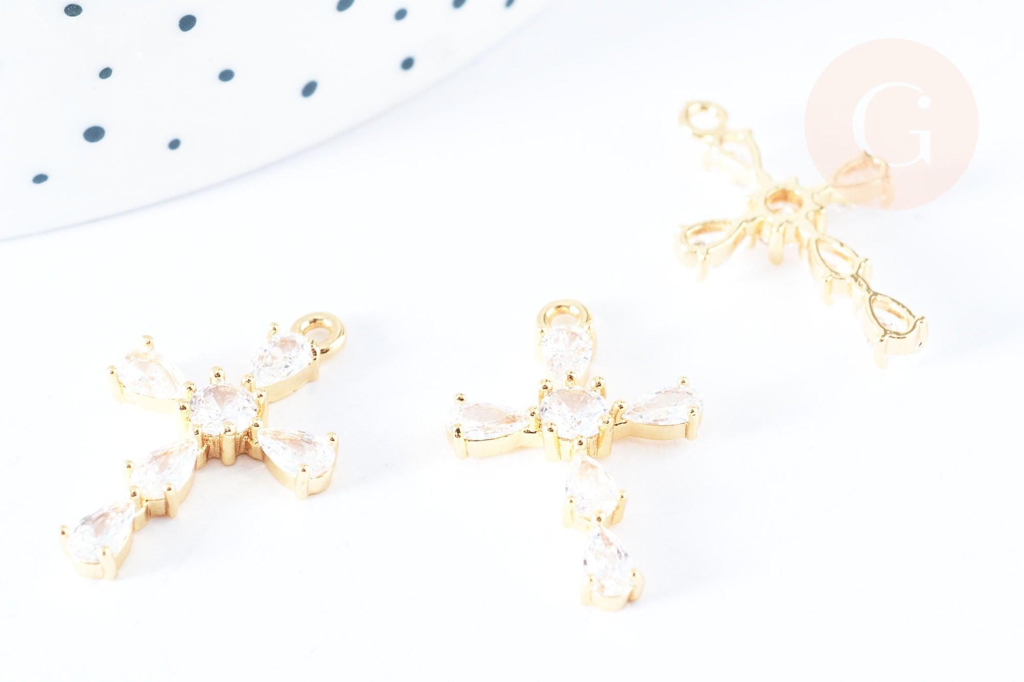 A magnificent cross pendant in 18k gold-plated brass is covered with faceted, transparent white zircons . Please note: the pattern is present on one side.