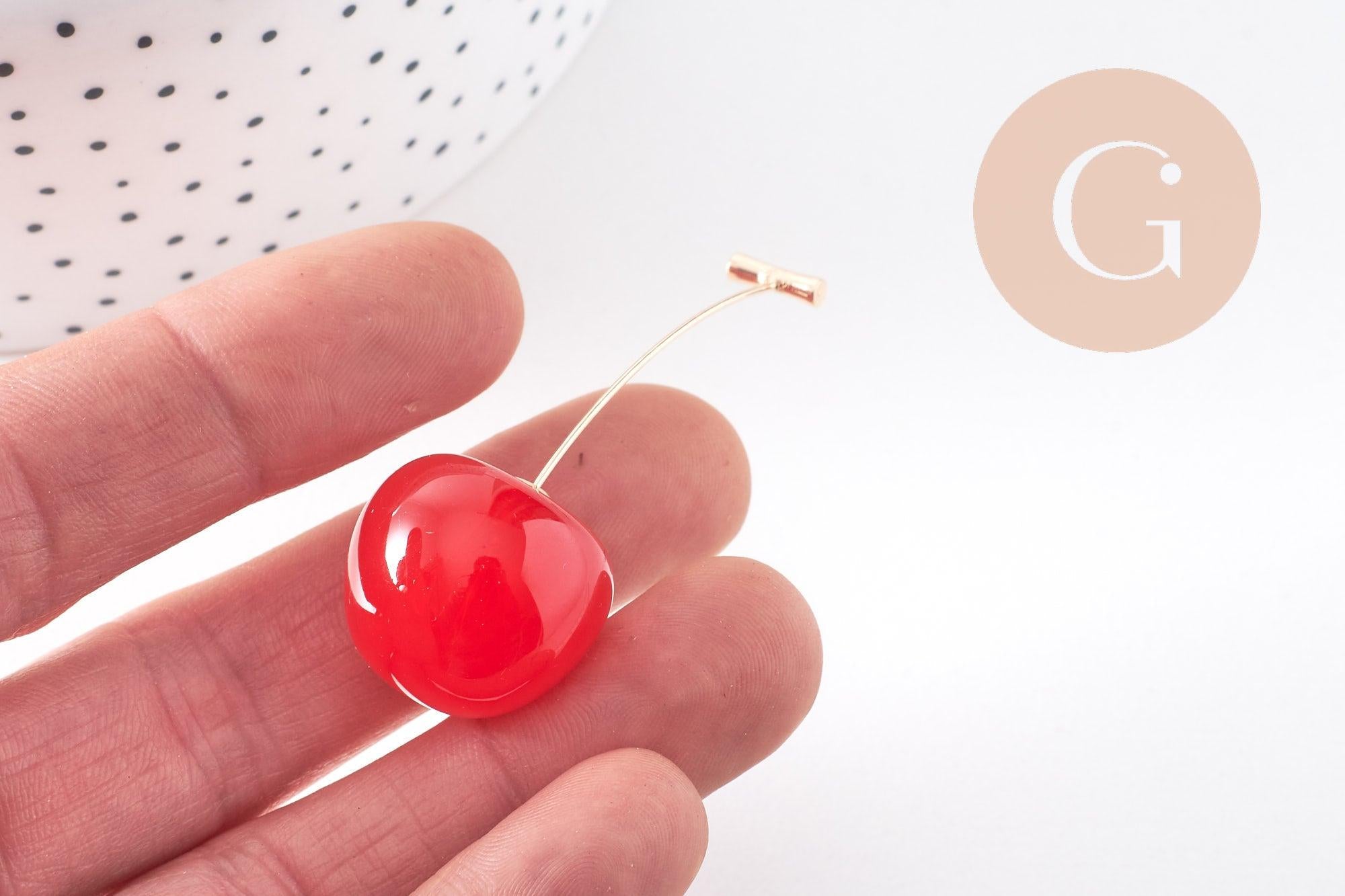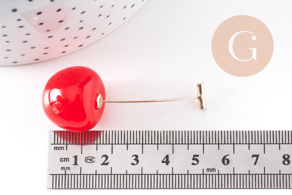 cherry earrings red resin gold zamac 50mm, pair (G10355)