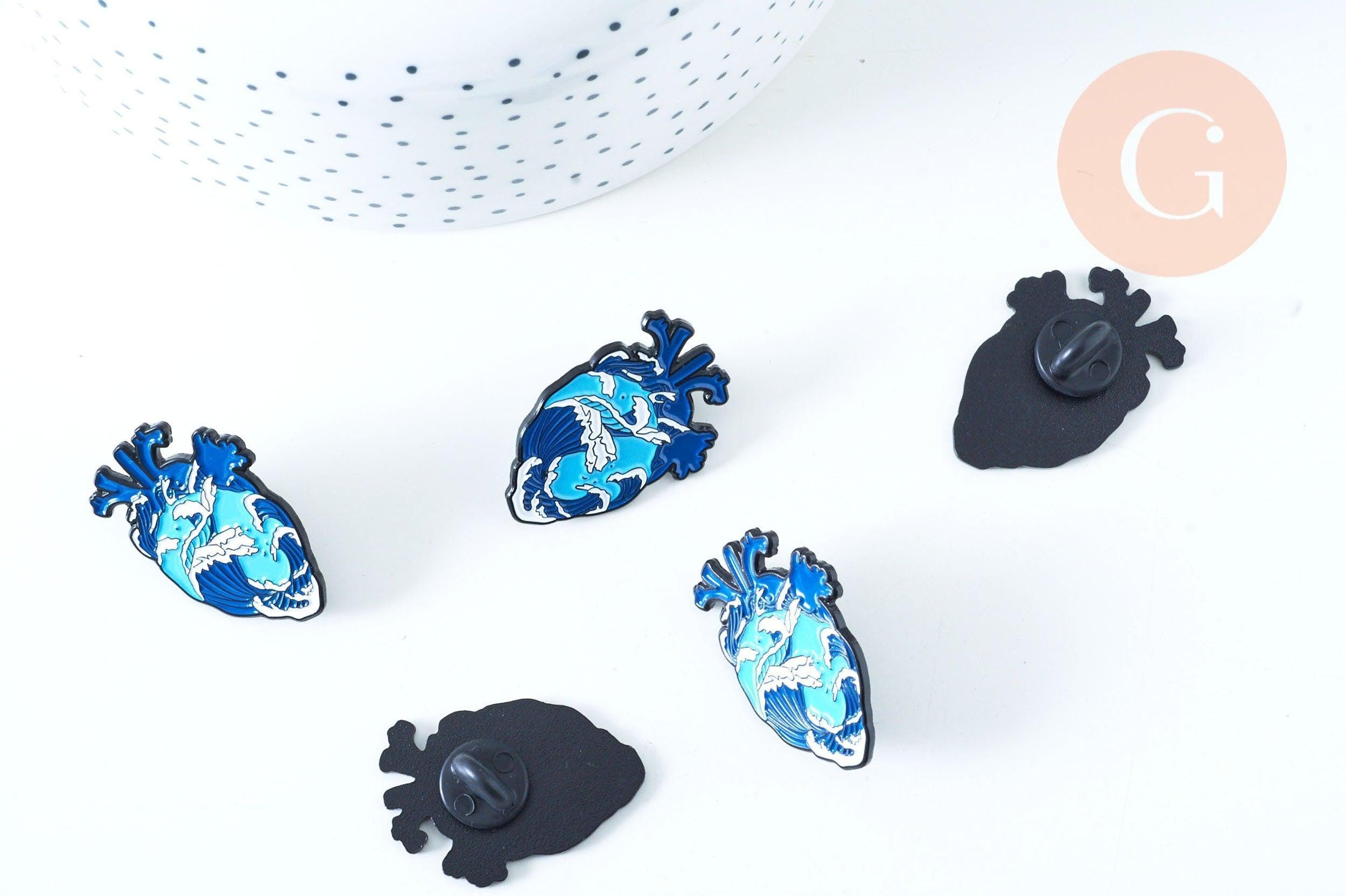 We offer you this pretty pin, in gold zamac, representing a heart decorated with waves and ocean in vibrant blue enamel.