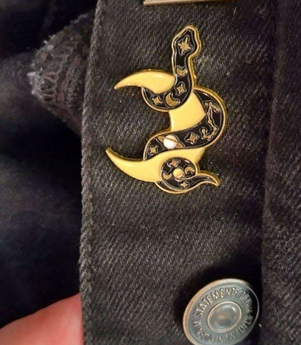 We offer you this delightful brooch / Pin representing a snake wrapped around a crescent moon. Mystical symbols, in gold zamac and colored enamel.