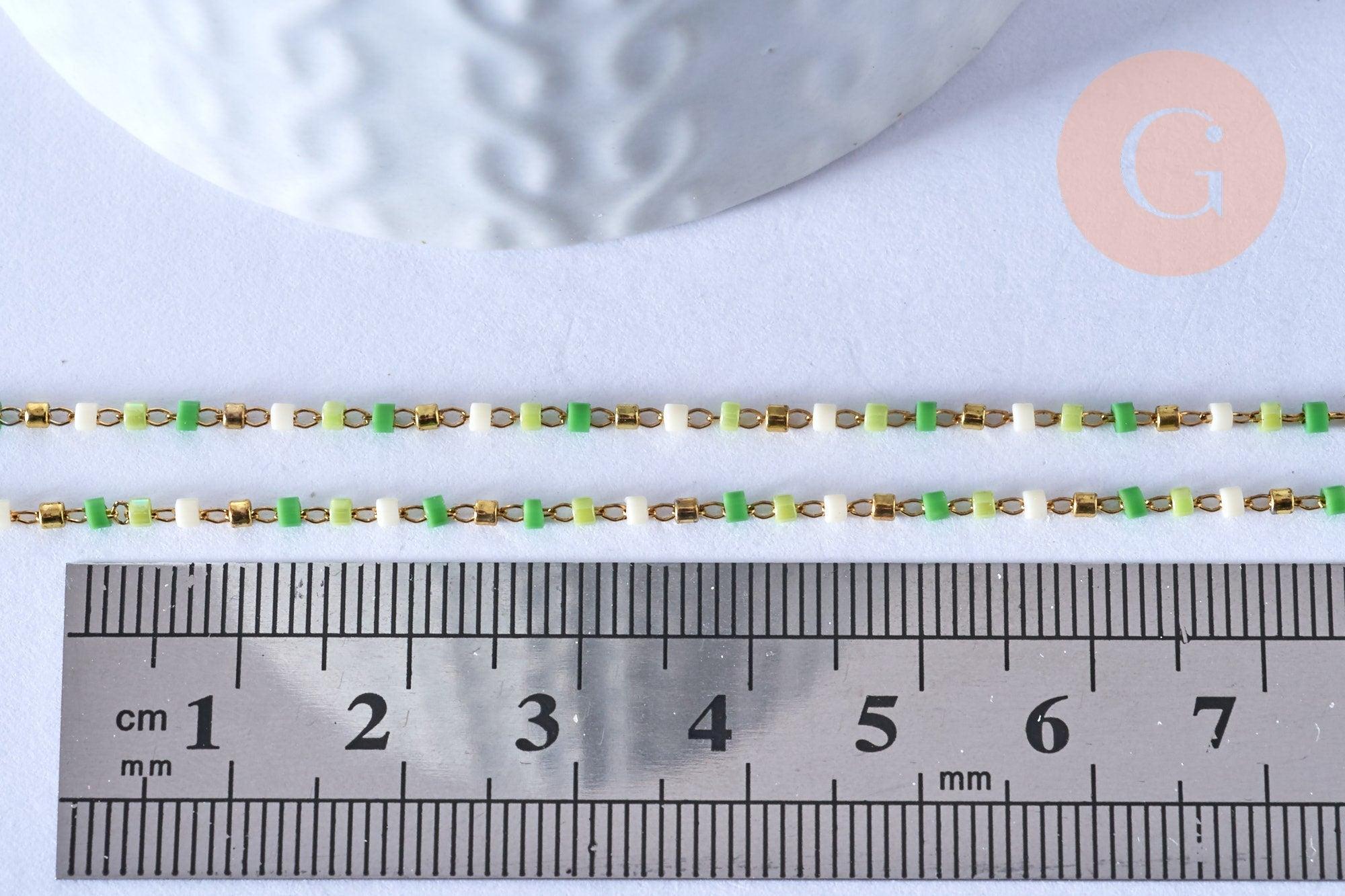 Chaine avec fermoir acier inoxydable doré perle rocaille vert artisanale, 40.7cm, x1 (G4104)