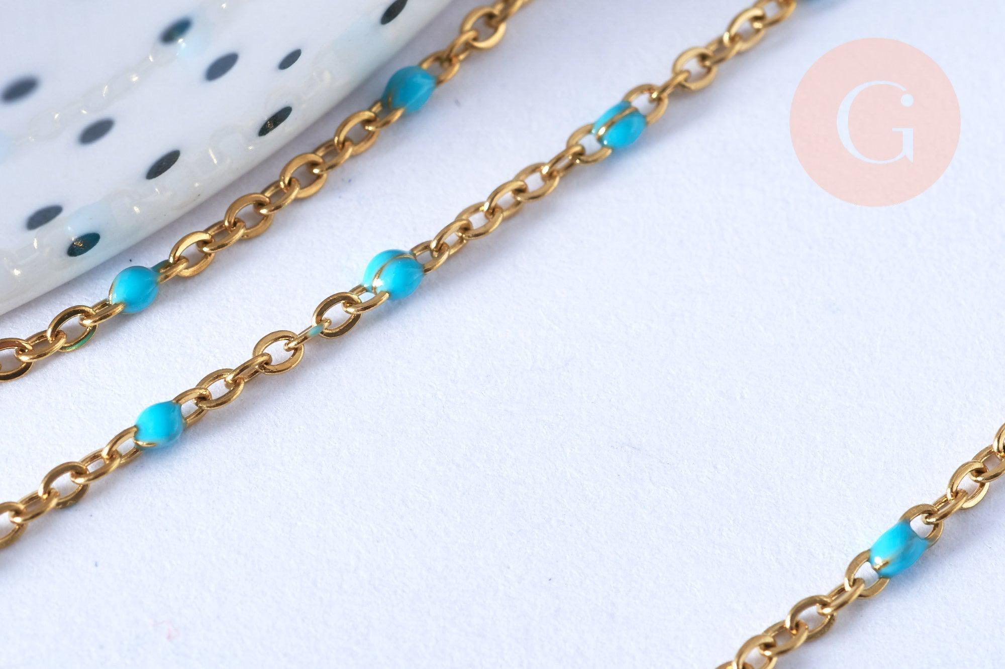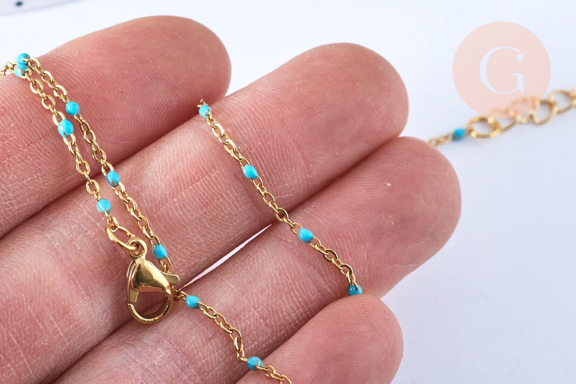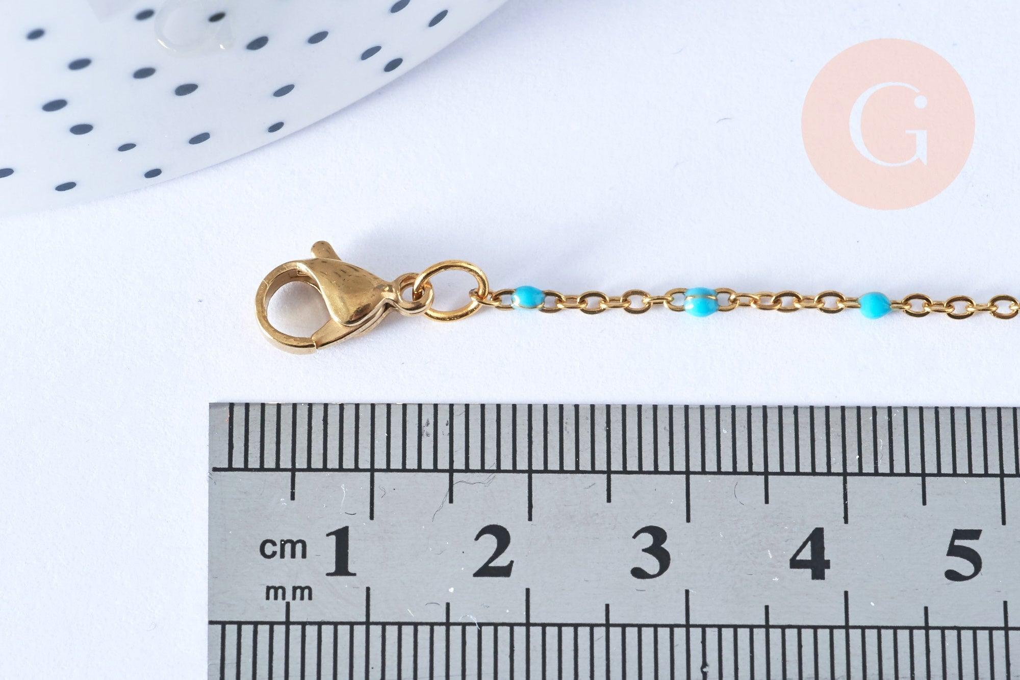 Chaîne fine acier doré inoxydable émail bleu turquoise 43cm, sans nickel, x1 G7113