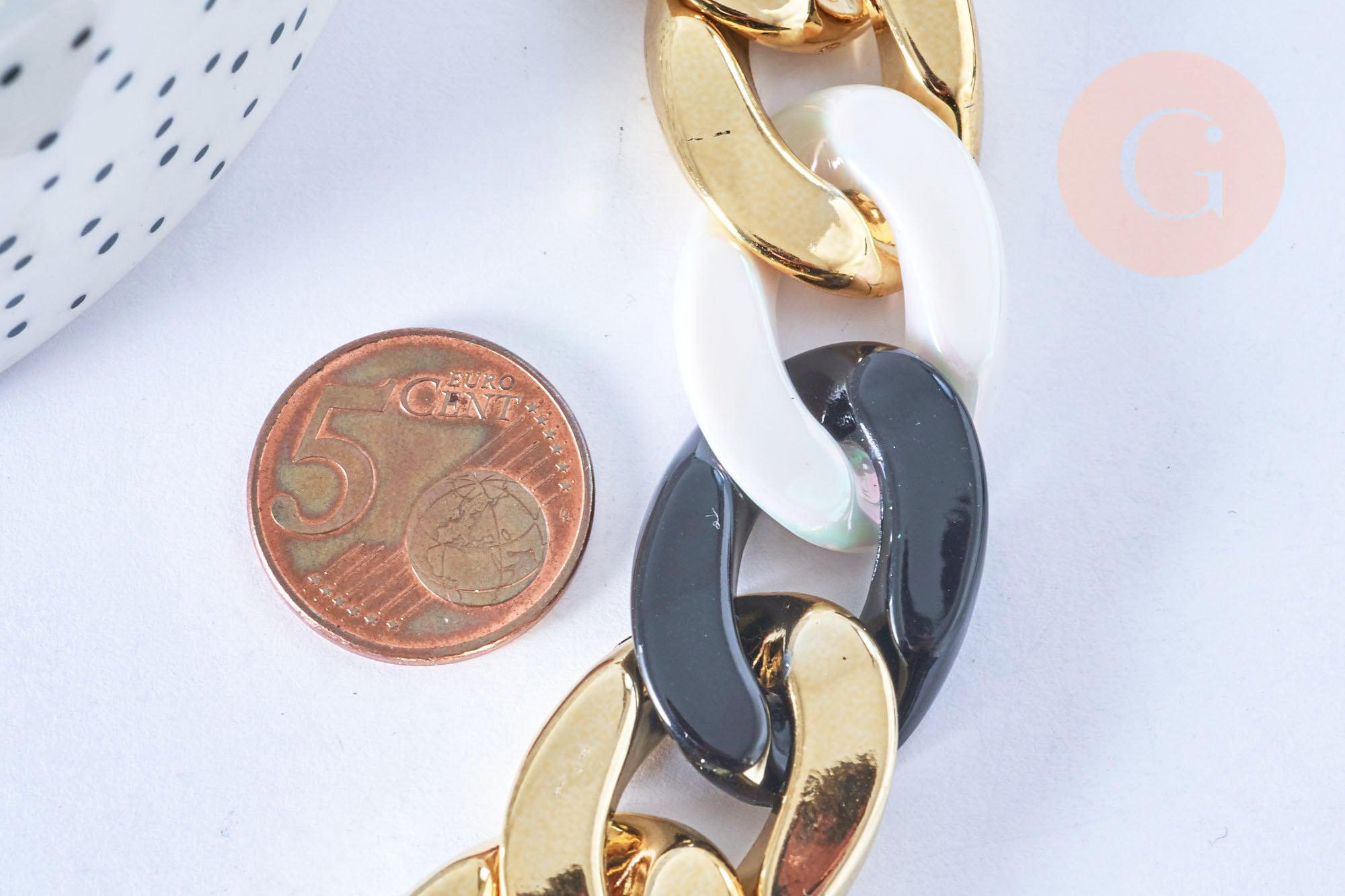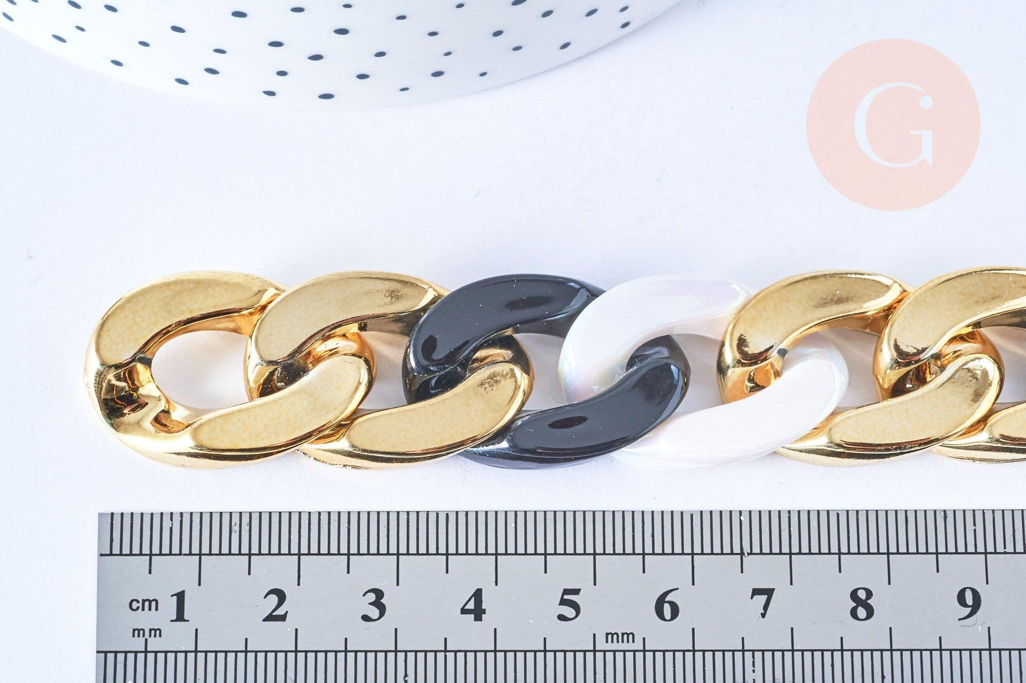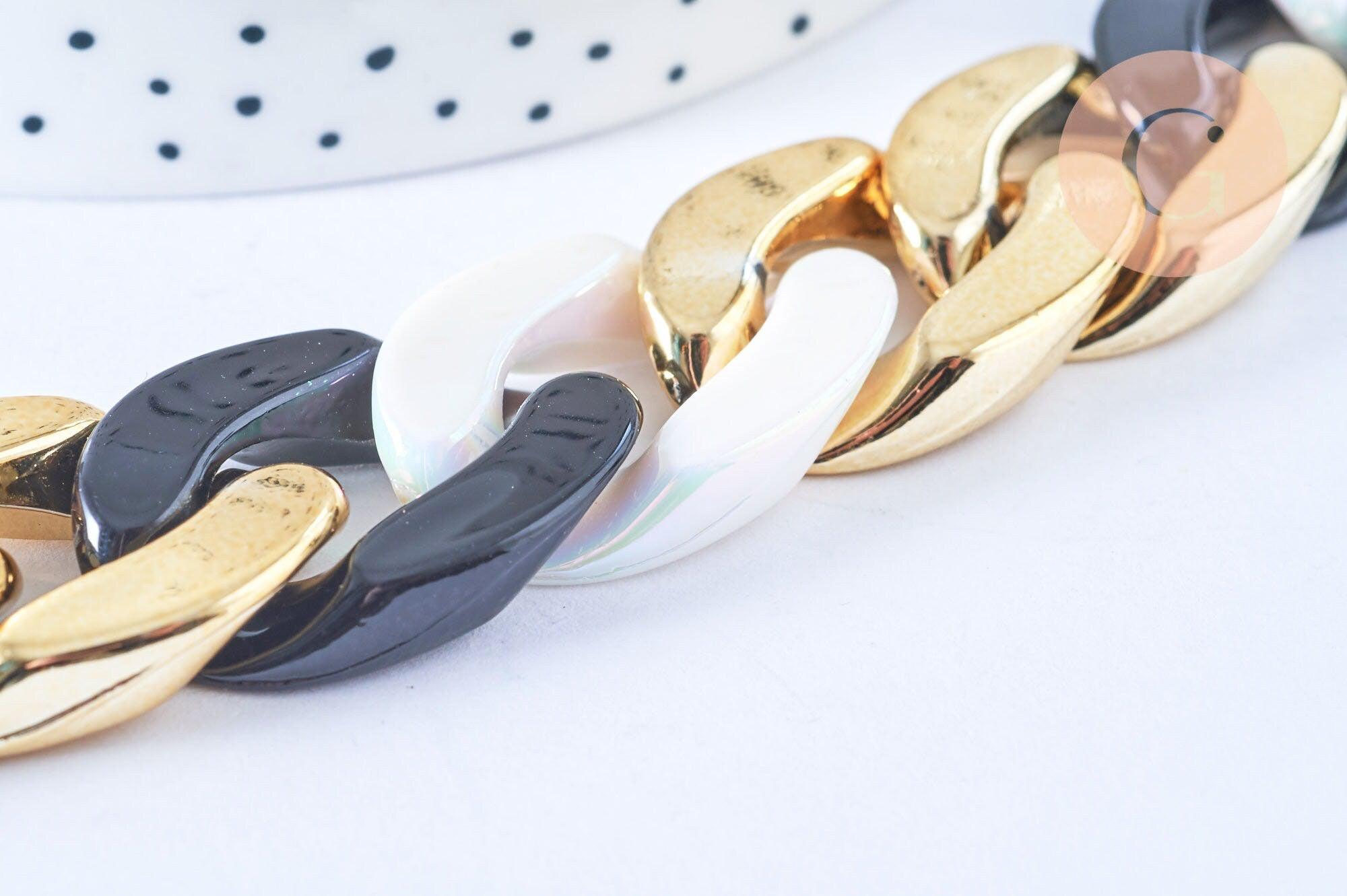 Make a statement with this chunky black and white acrylic plastic chain accented with gold aluminum links. Ideal for creating modern, graphic, and bold jewelry , this chain will quickly become the centerpiece of your statement necklaces, bracelets, or earrings.