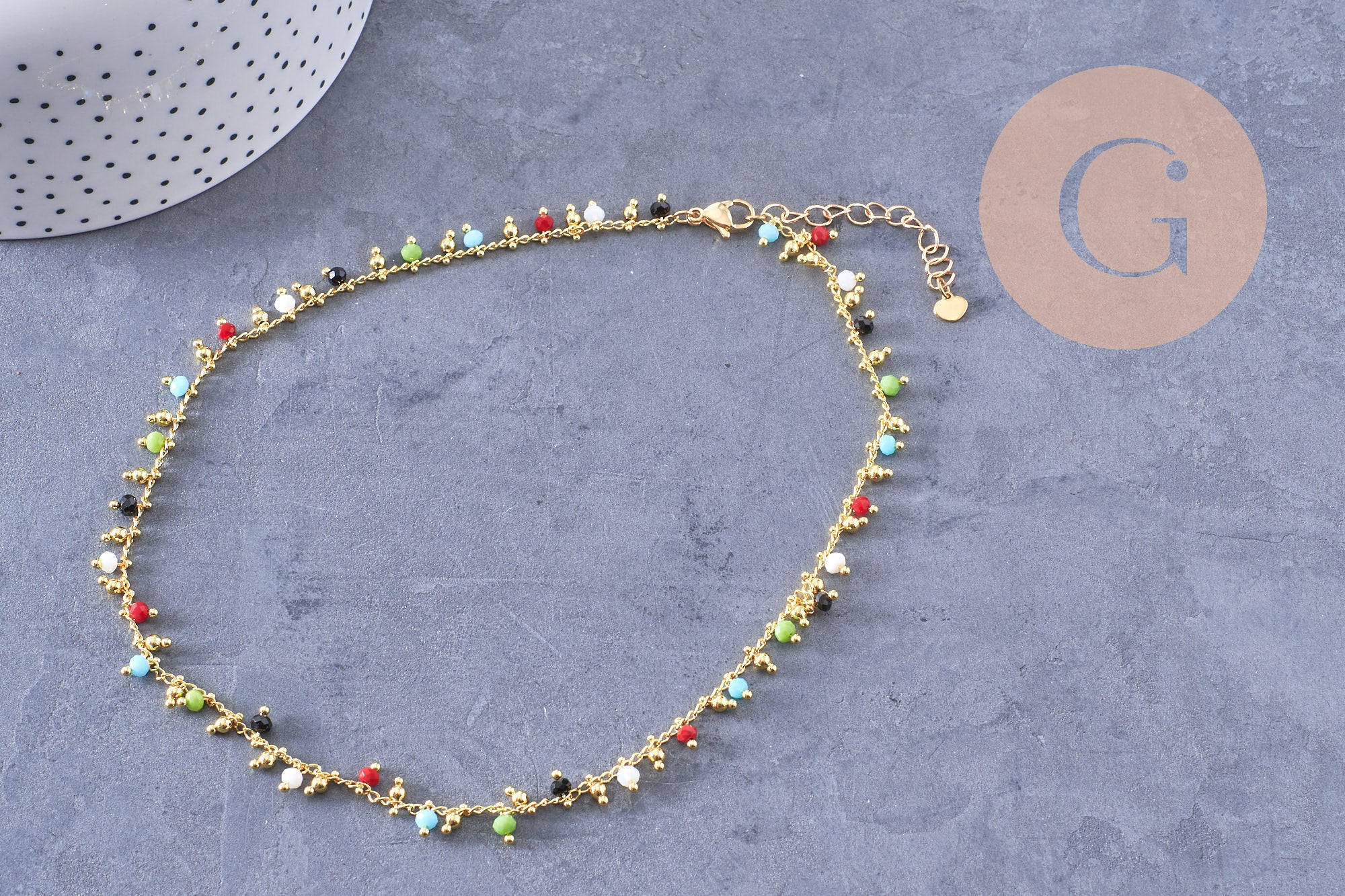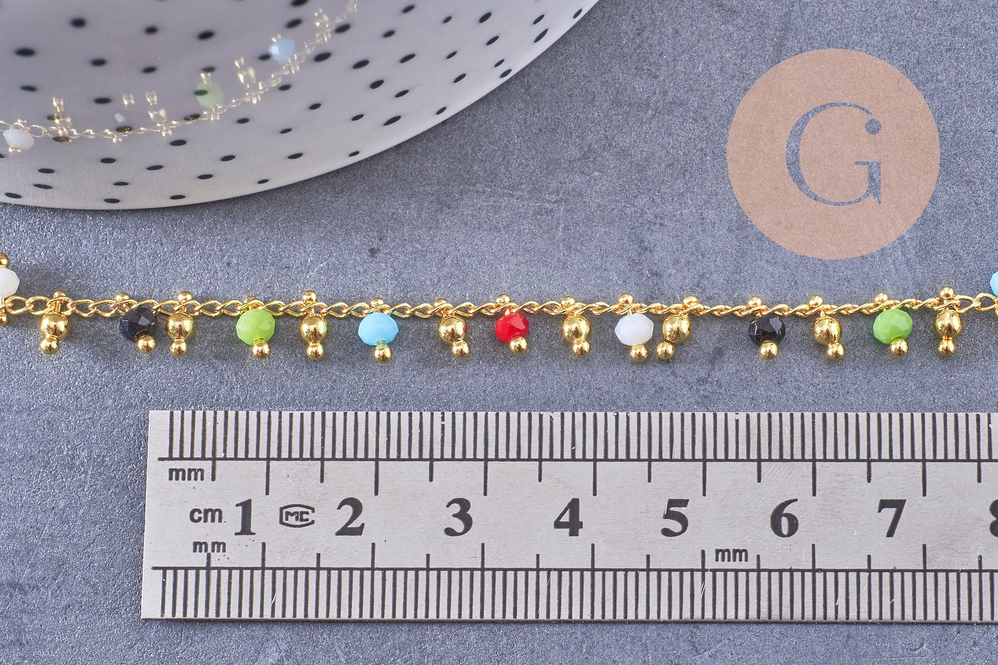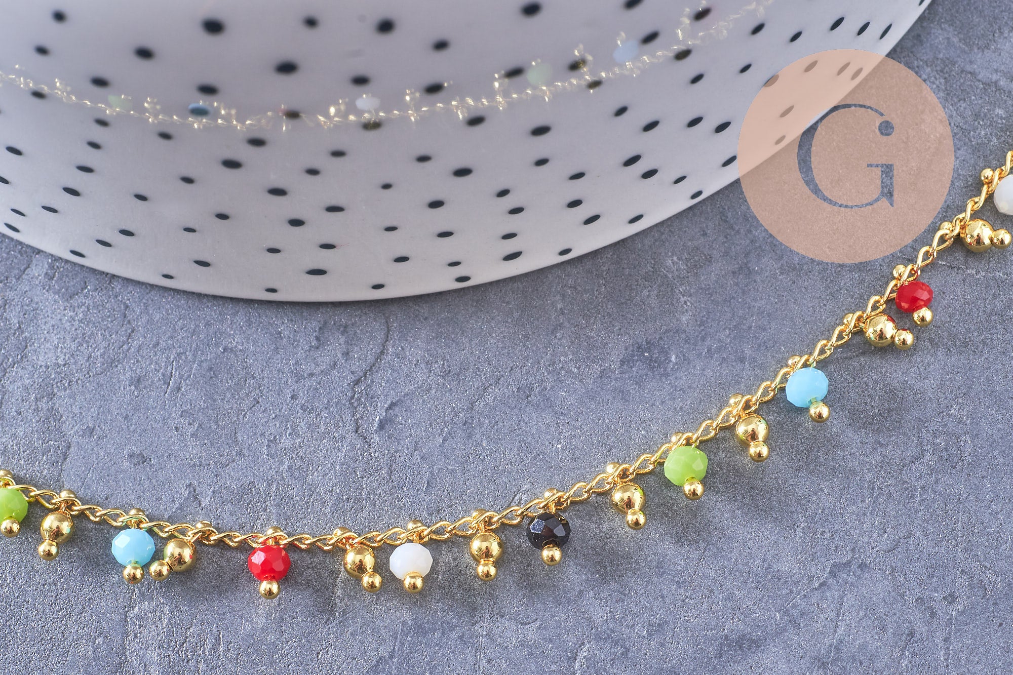 Bring color and light to your creations with this fancy chain , decorated with a multitude of multicolored glass beads . Mounted on a base in 18K fine gold-plated brass , this chain is sold ready to use, with a gold-plated stainless steel clasp already attached.