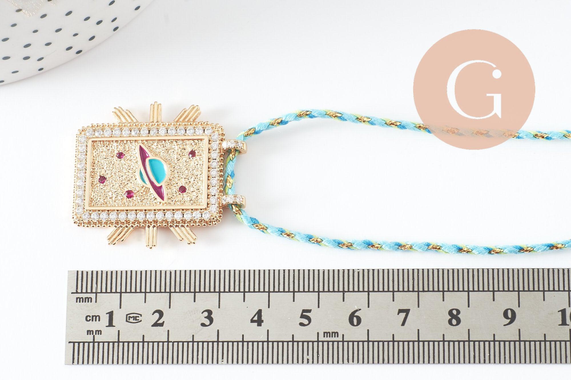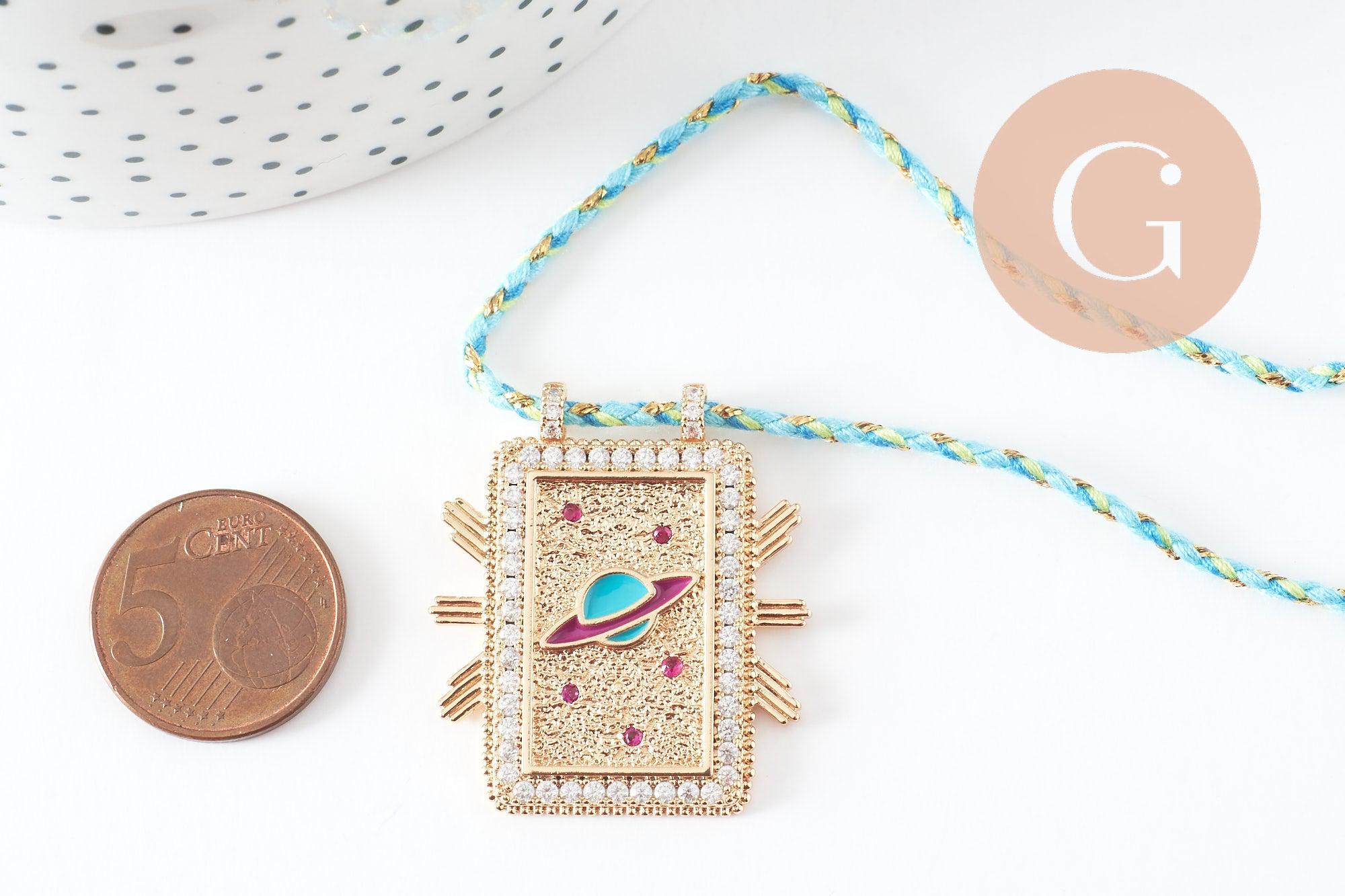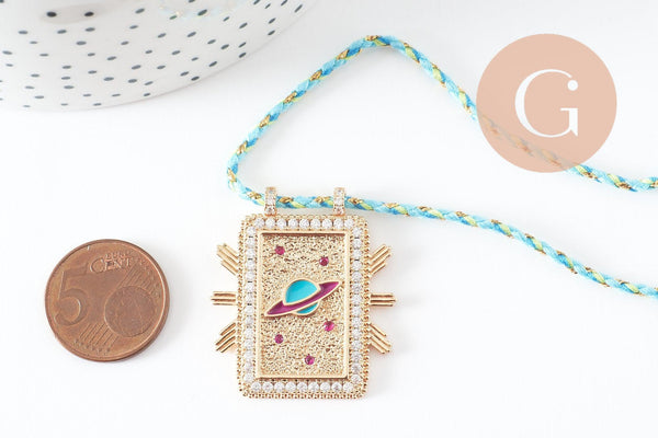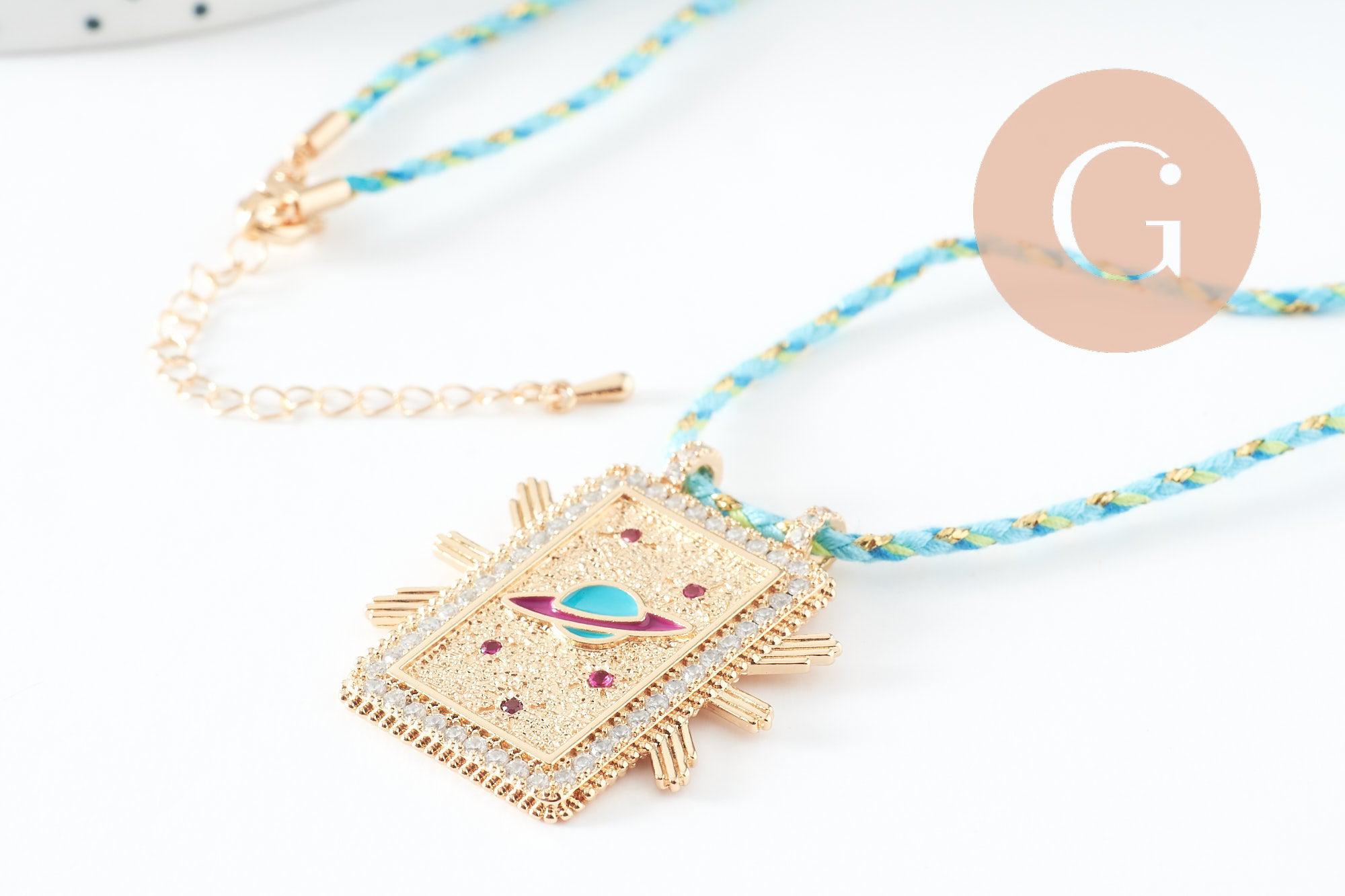 Necklace enameled planet zircon medal gold zamac, braided cord necklace 45cm x1 (G9566)
