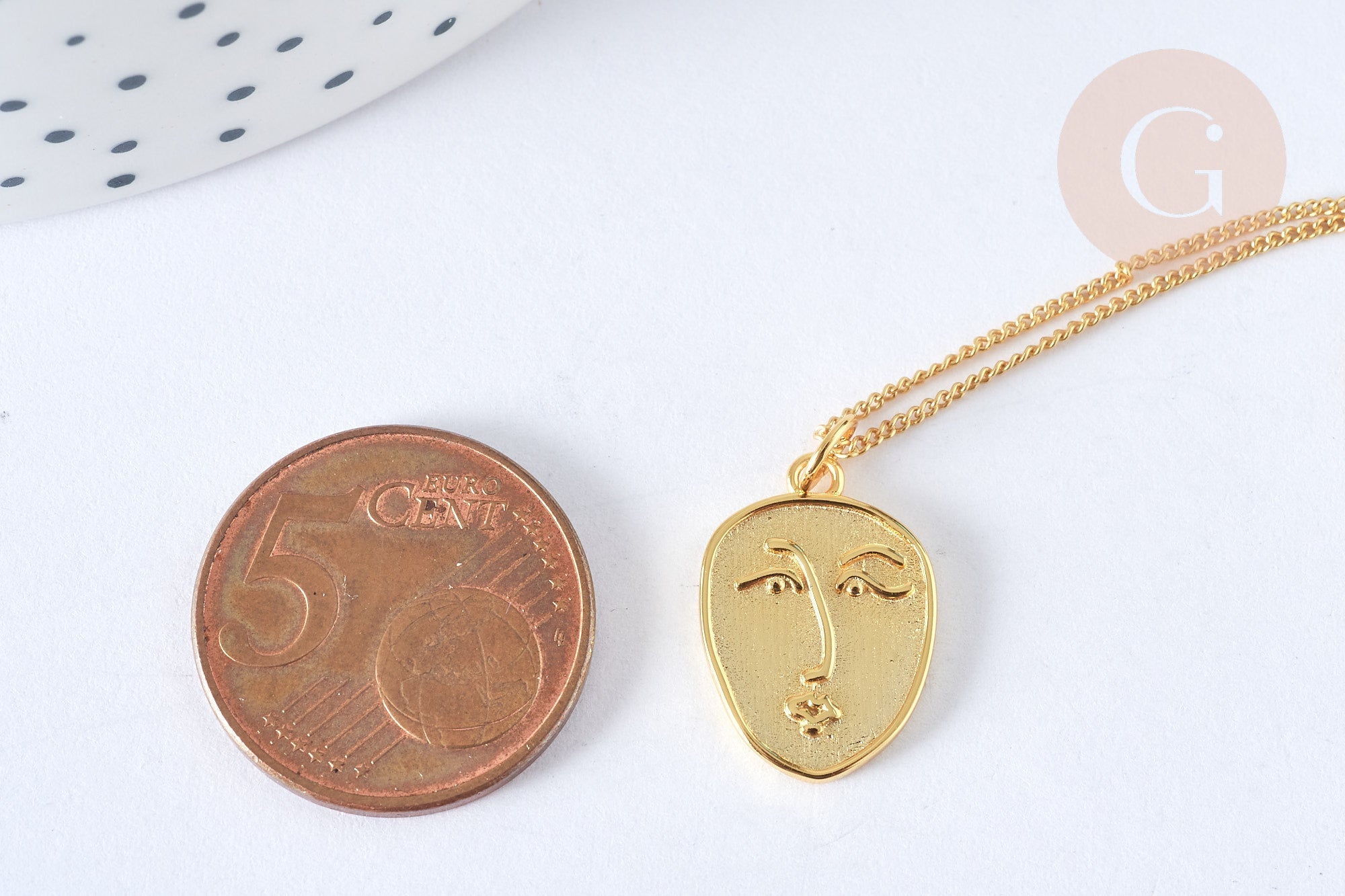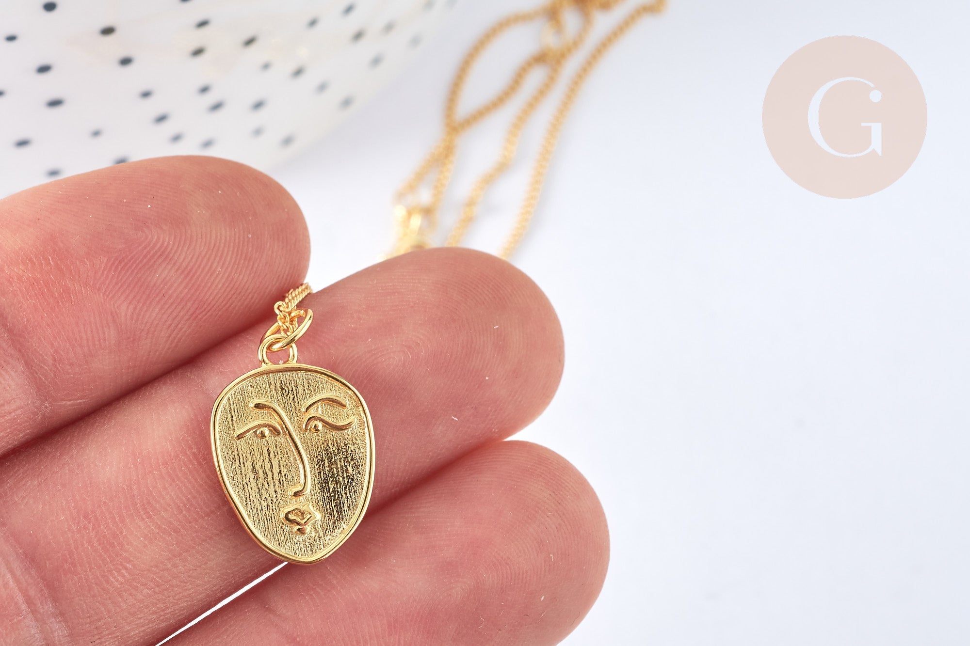 A cable chain necklace in solid 925 silver covered with a thin layer of 24K gold, featuring a delicate medal representing an arty face. A nice gift to give (to yourself).