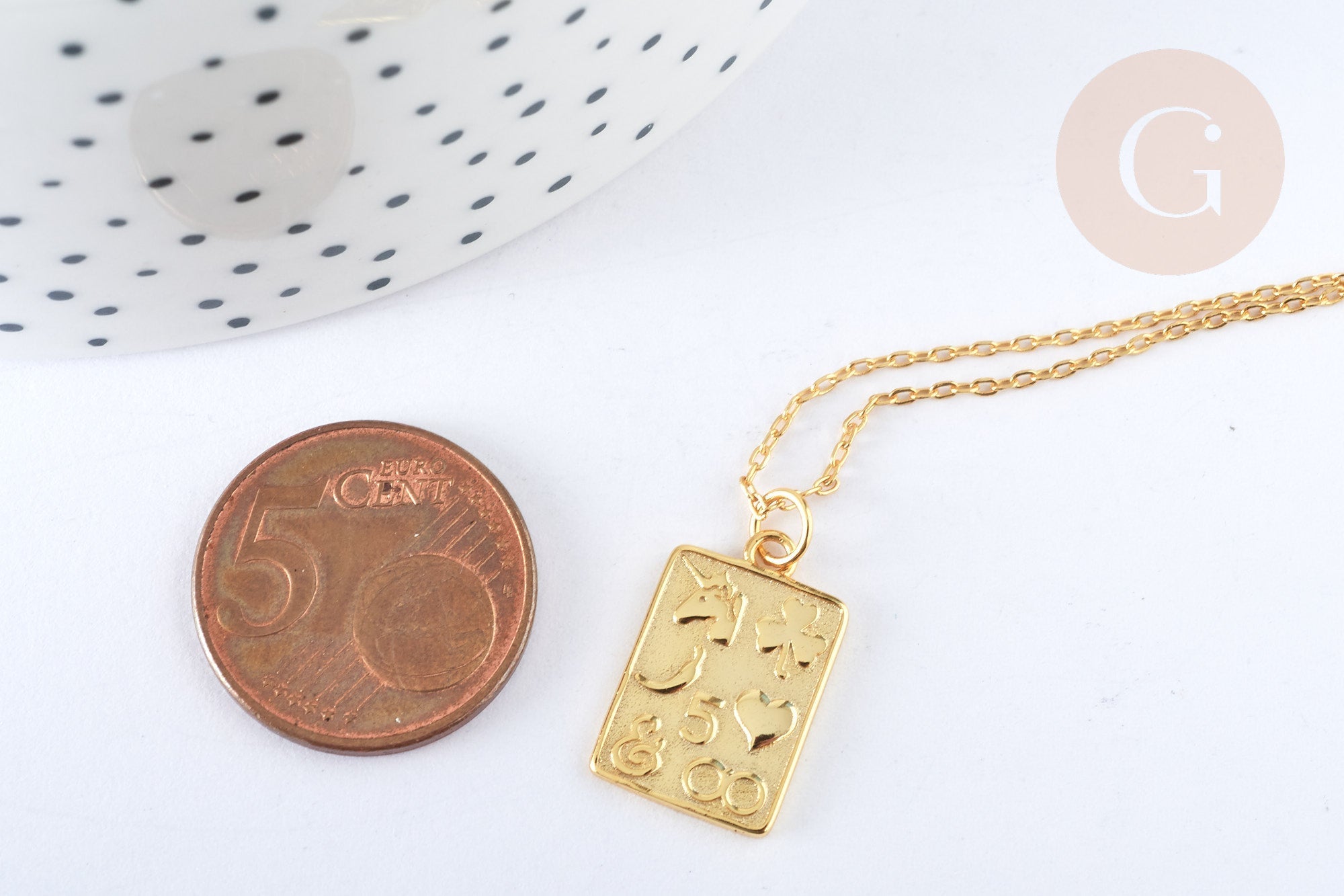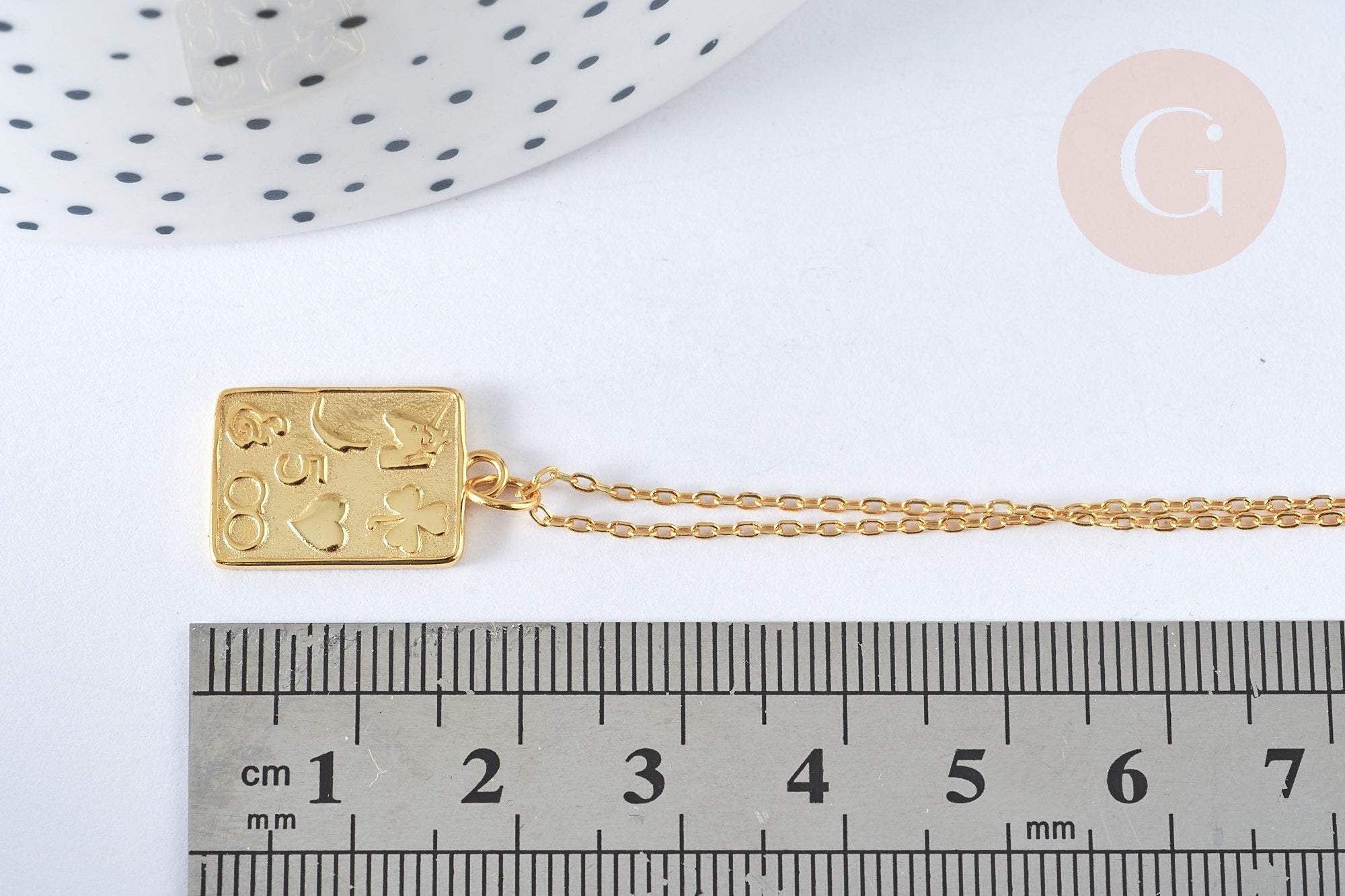 A cable chain necklace in solid 925 silver covered with a thin layer of 24K gold, featuring a delicate rectangle medal decorated with lucky symbols. A nice gift to give (to yourself).