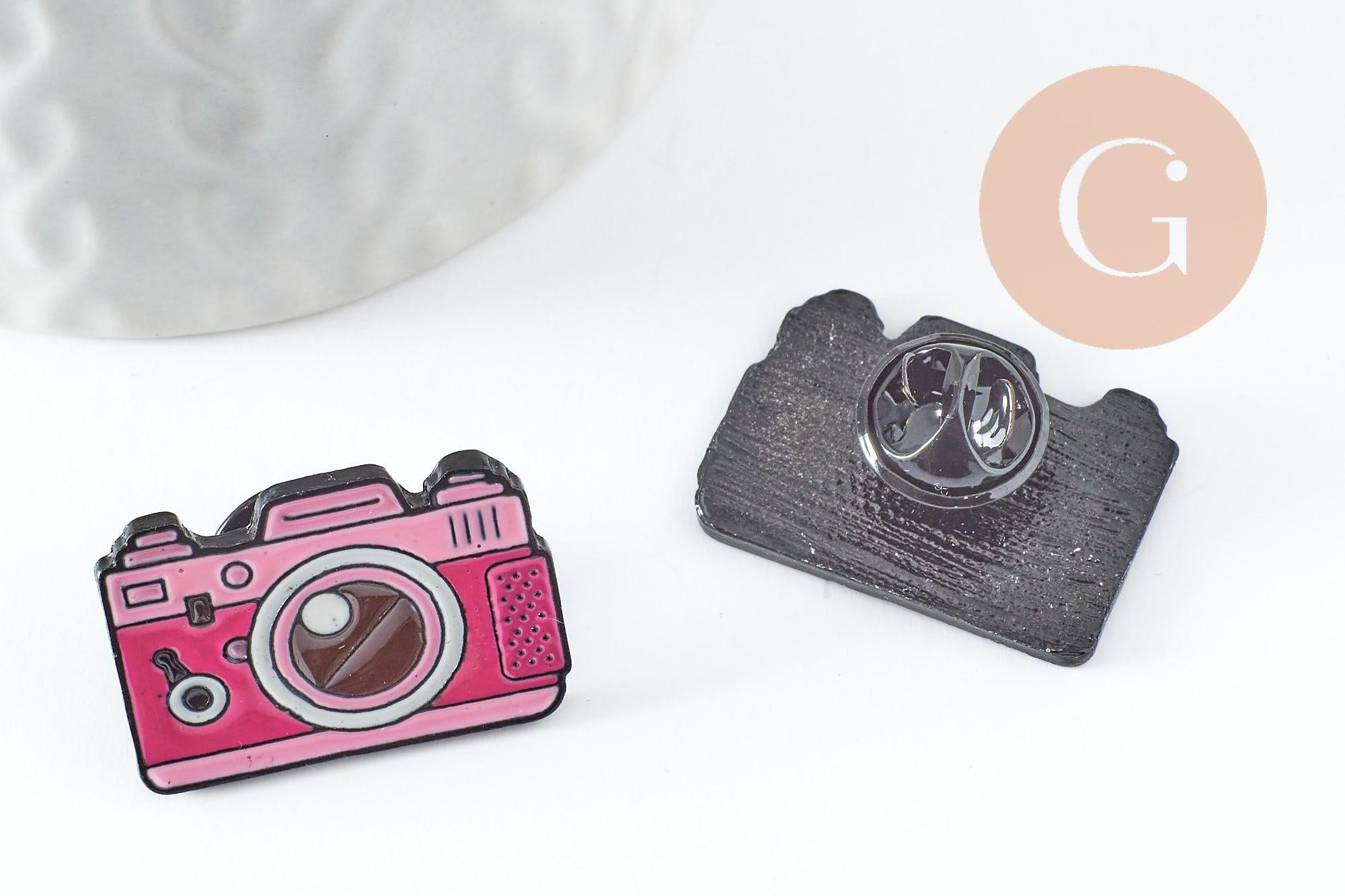 Broche pins appareil photo émaillé rose 24.5mm, x1 (G9471)