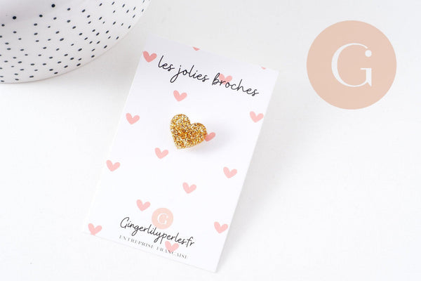 Add a touch of shine and tenderness to your outfits or creations with this heart-shaped brooch , in glittery gold Plexiglas , carefully made in our workshops in France. Its mini format (20 mm) makes it ideal as a personalized gift for a wedding , a bachelorette party , a birthday or even Mother's Day .