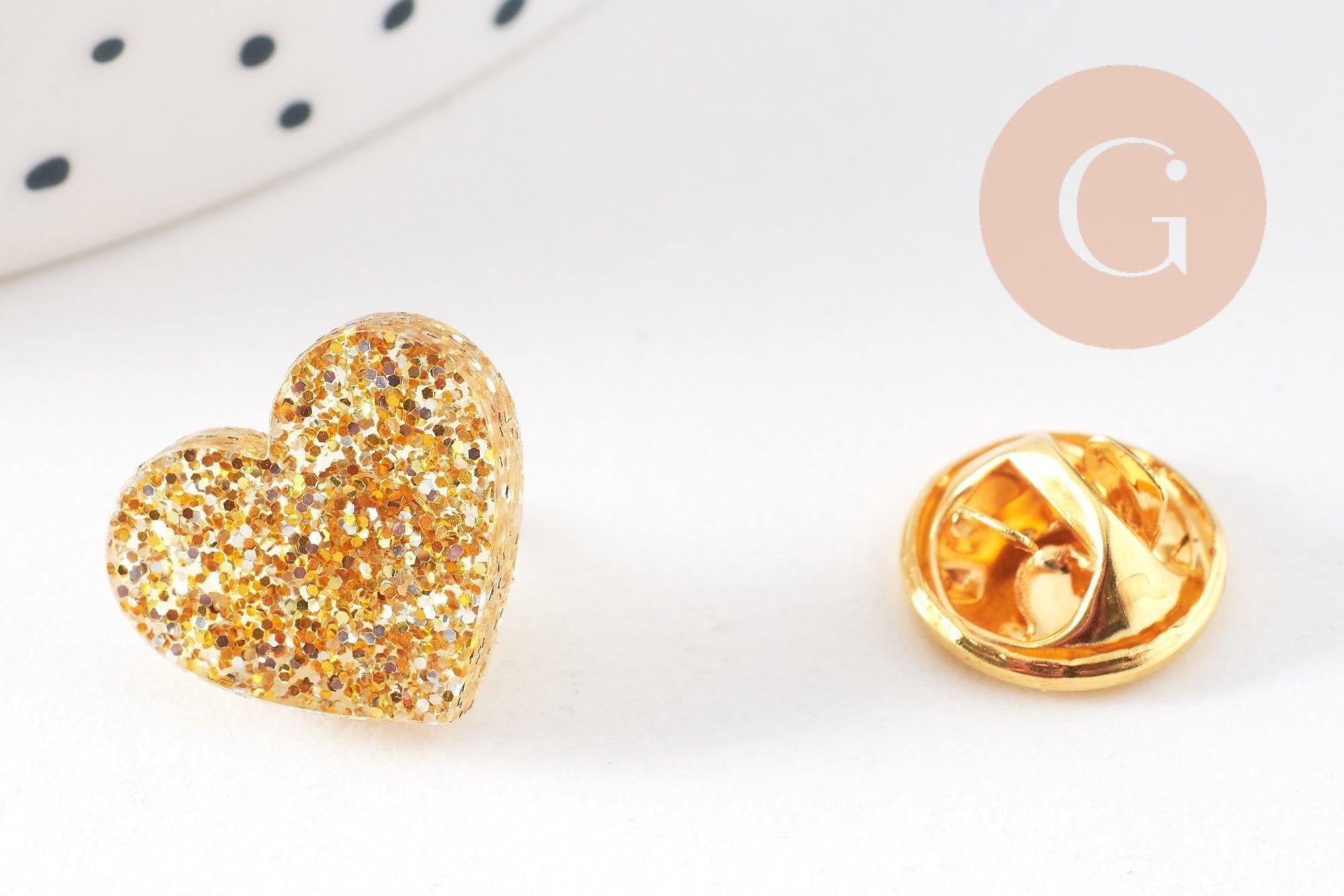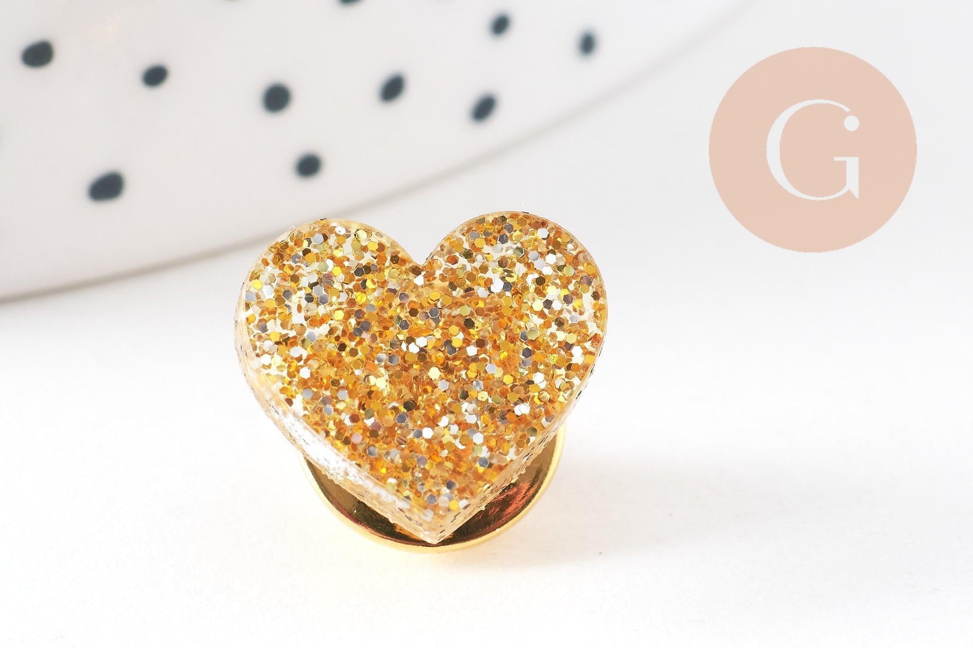 Broche pins coeur Plexiglas doré à paillettes 20mm, x1 (G10532)