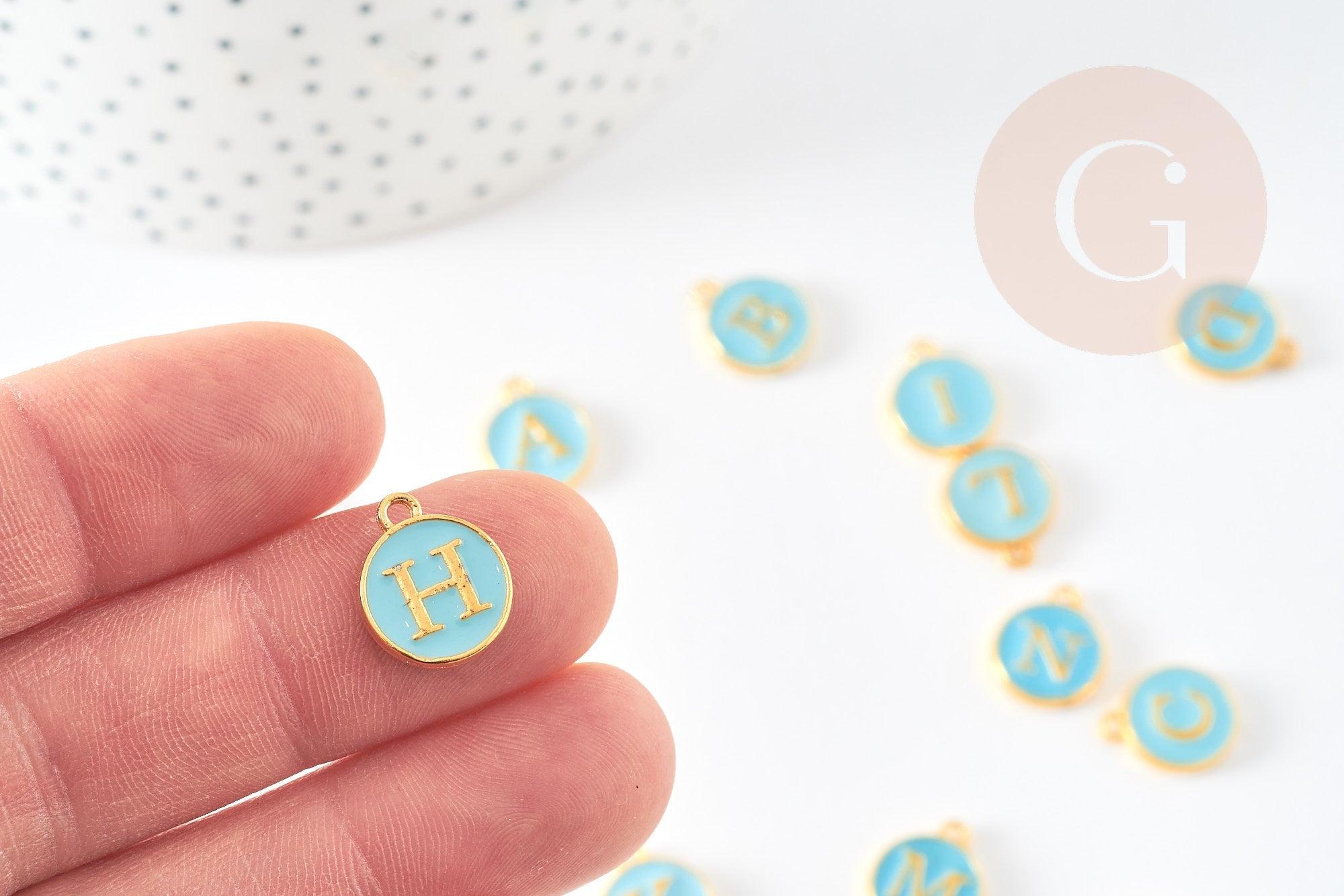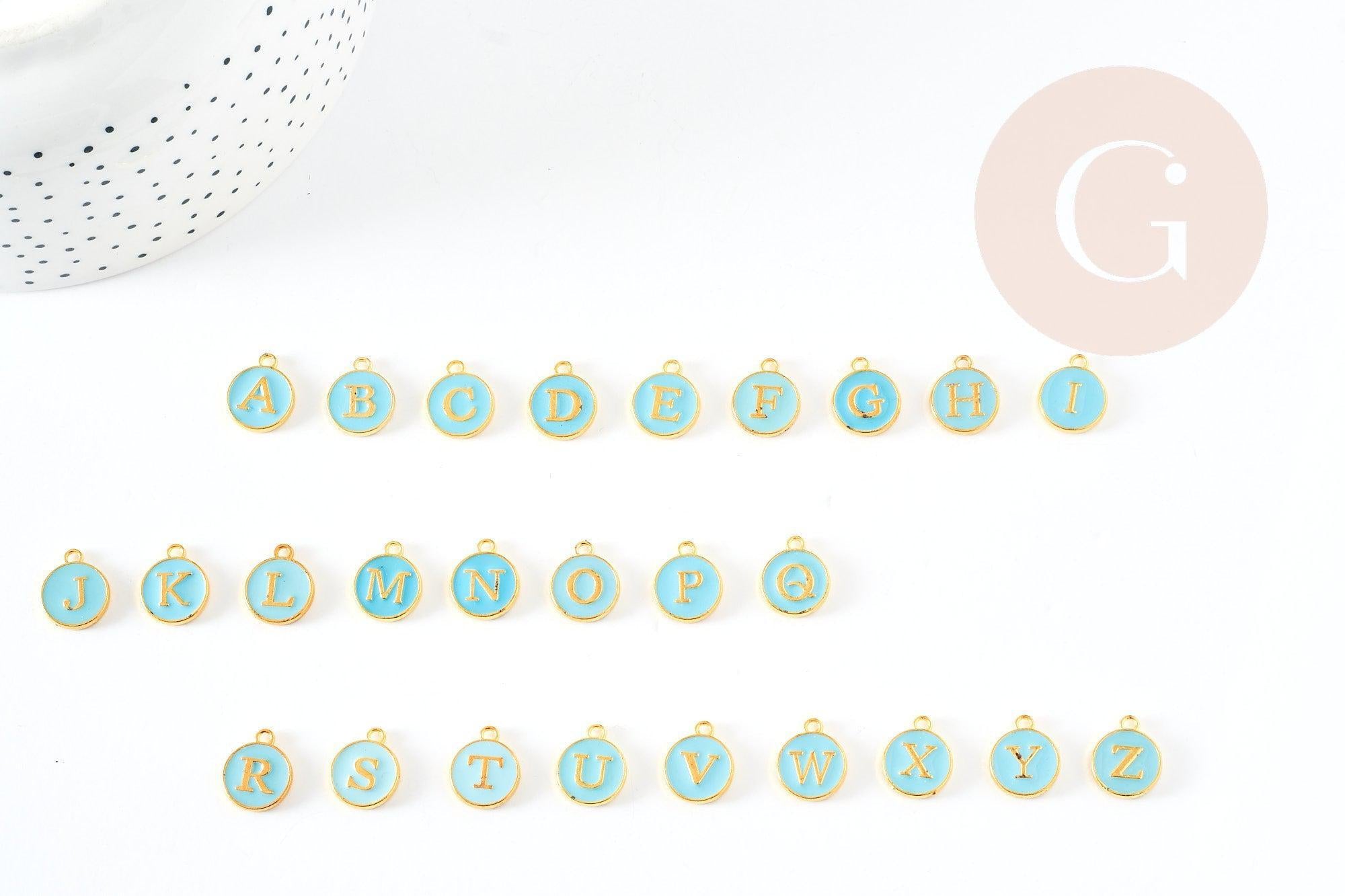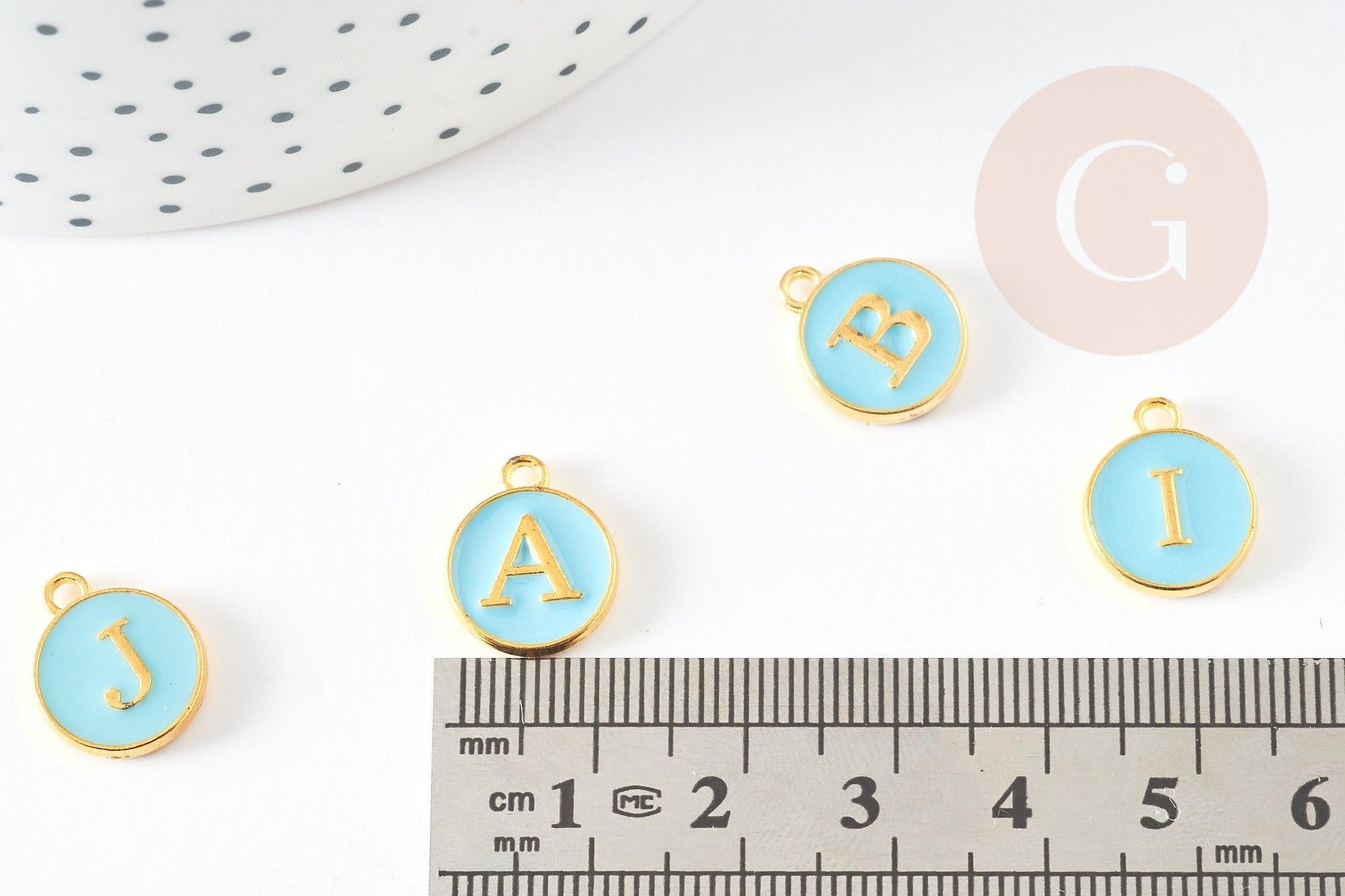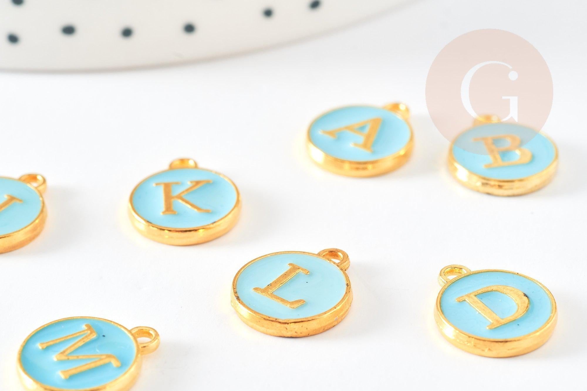 Round golden initial blue enamel pendant, Women's pendant, gold metal, initial pendant, jewelry creation, 14mm, unit