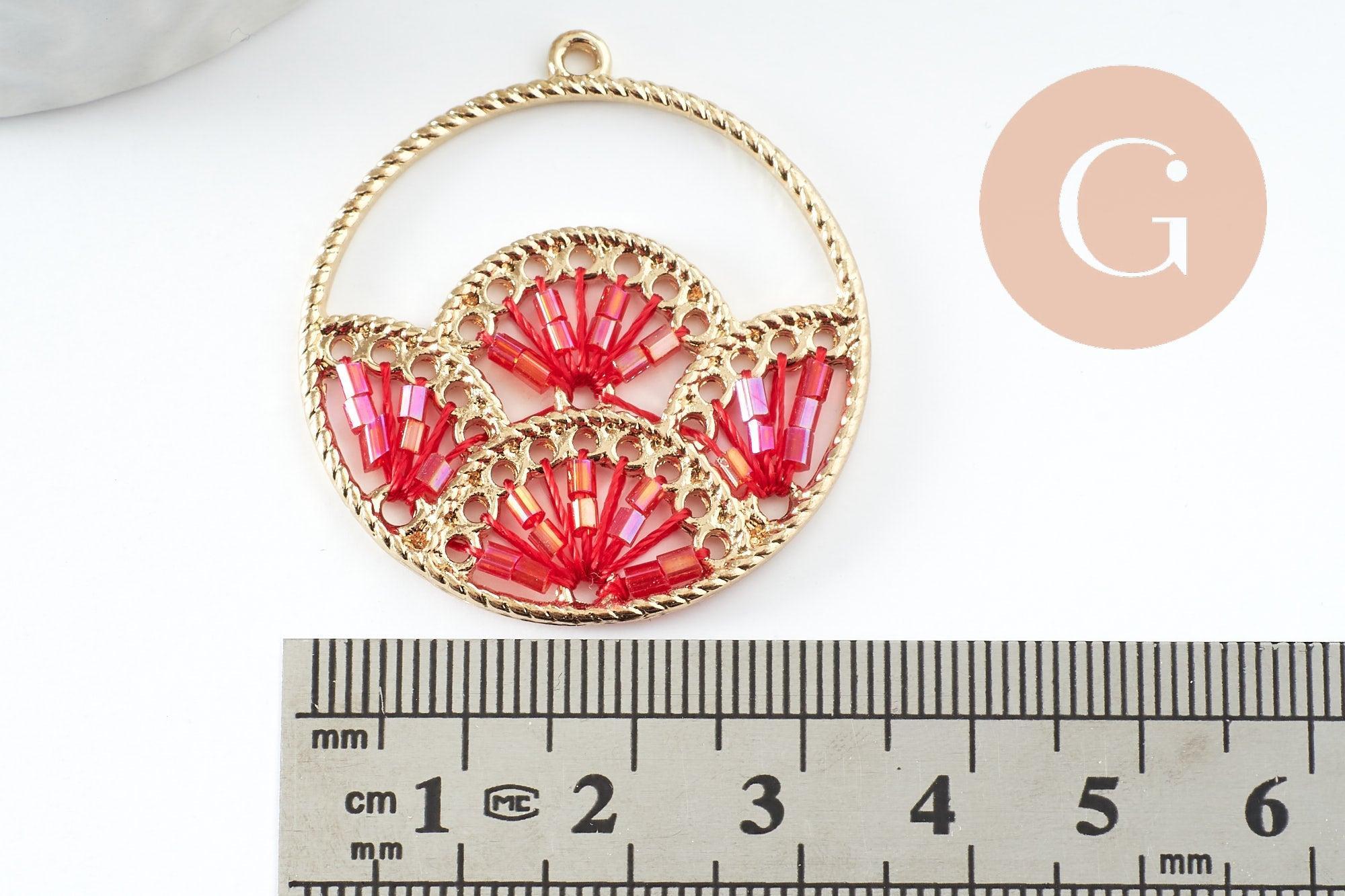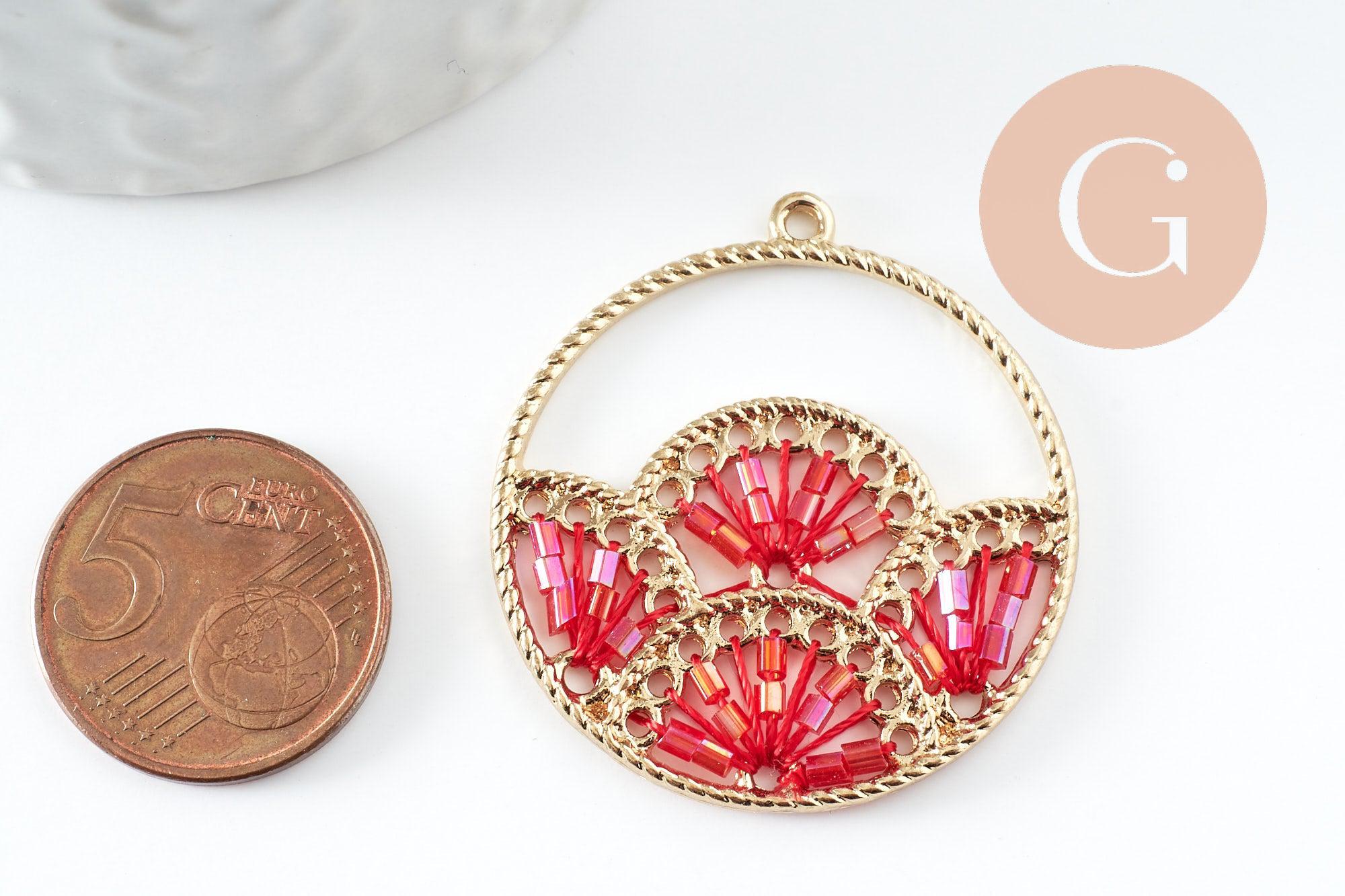 Pendentif rond zamac doré tissé rocaille rouge irisé dentelle 37.5mm, x2 (G4134)