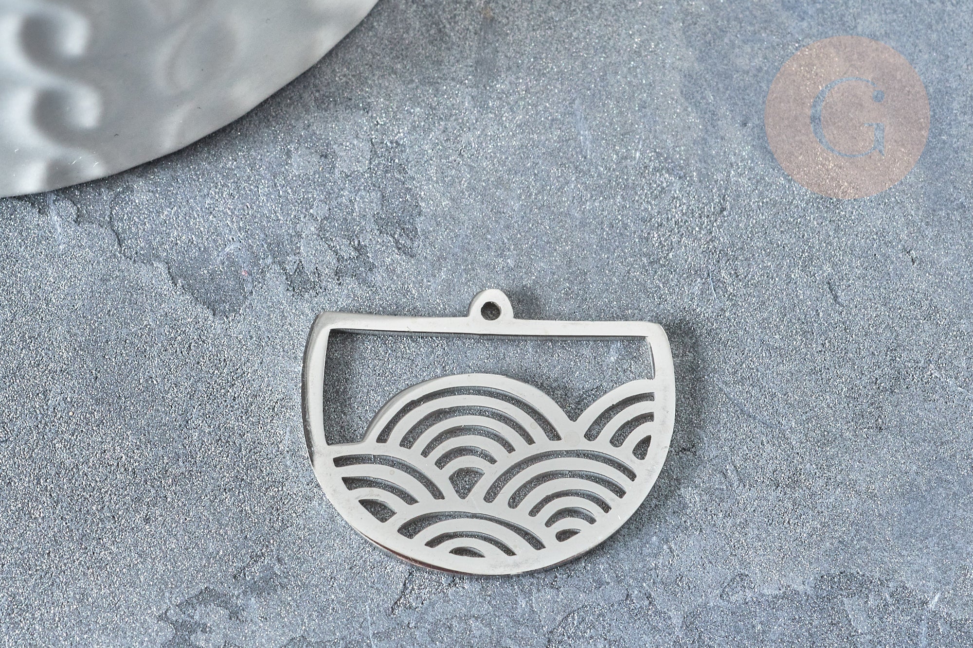 A platinum stainless steel half-circle pendant decorated with a Japanese wave pattern. A silver pendant ideal for your DIY creations.