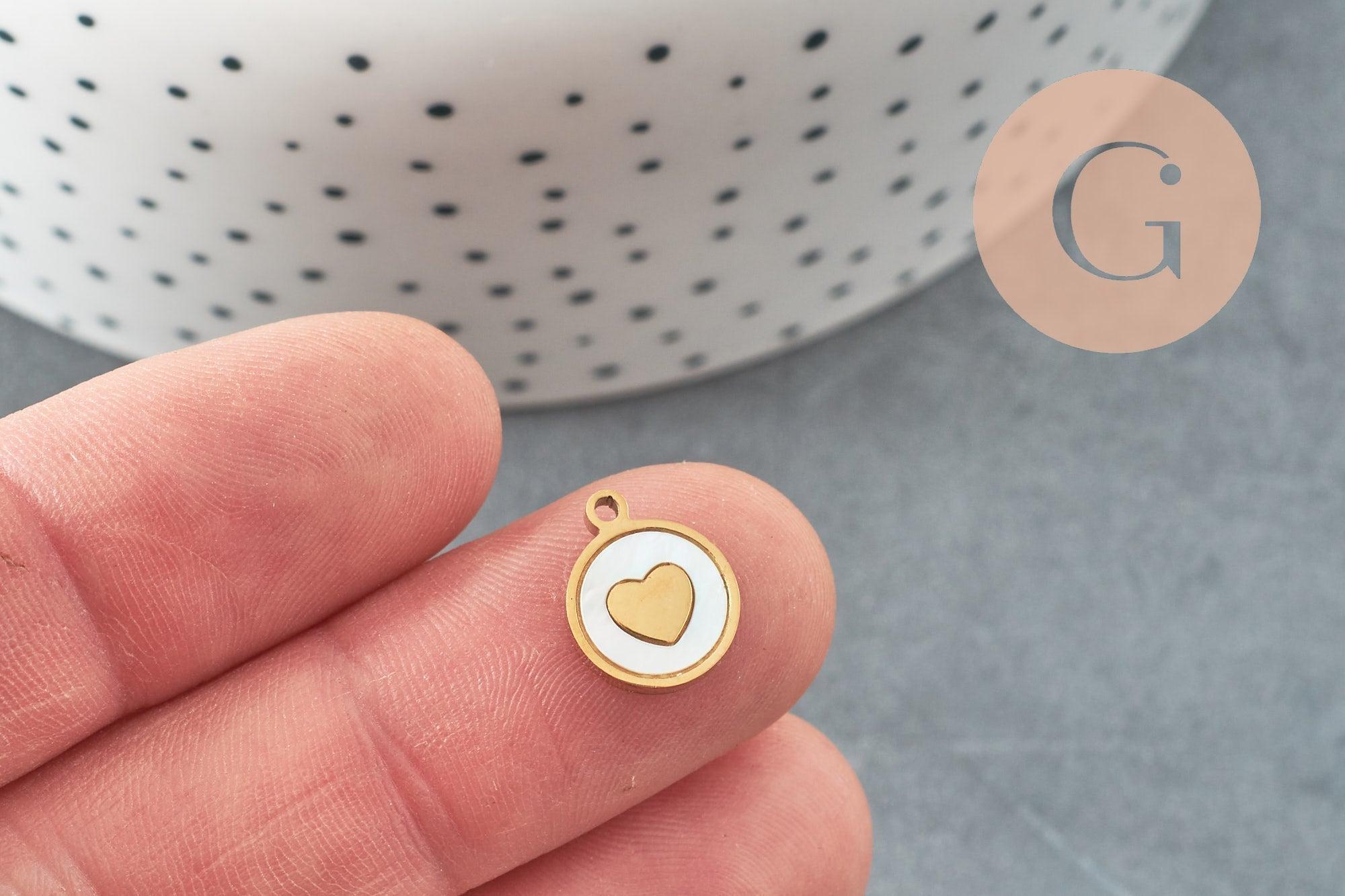 Pendentif médaille rond coeur nacre naturelle blanche acier 304 doré inoxydable, x1 (G9658)