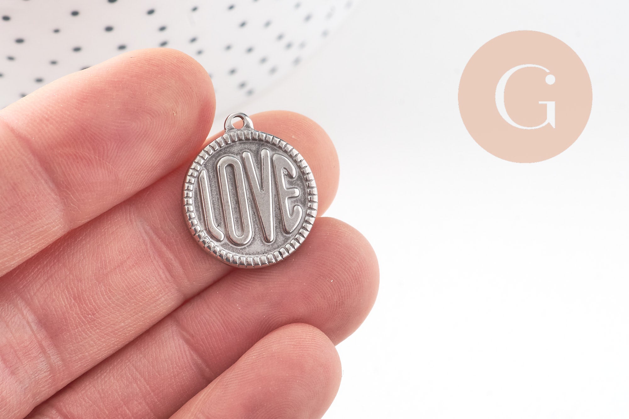 Add a timeless and symbolic touch to your creations with this round medal pendant in 201 stainless steel with a platinum finish , engraved with the word LOVE . Elegant and durable, it fits perfectly into modern and minimalist jewelry.