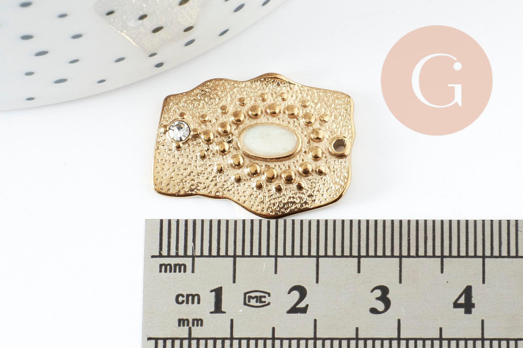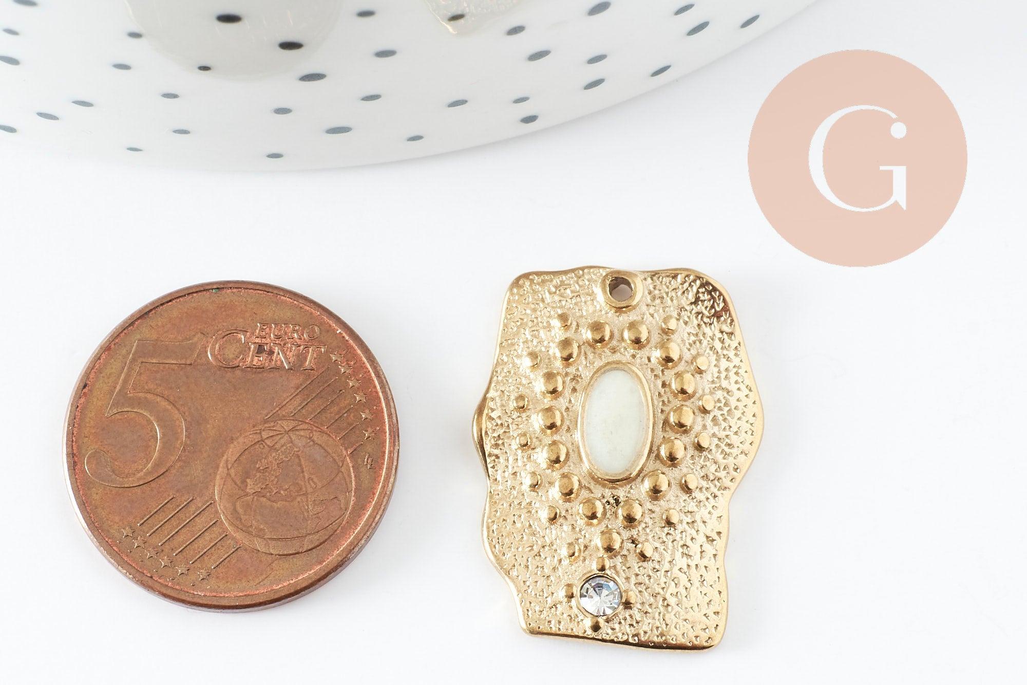 This rectangular pendant in gold-plated 304 stainless steel , decorated with a white resin cabochon and a sparkling zircon, is a piece of rare elegance.