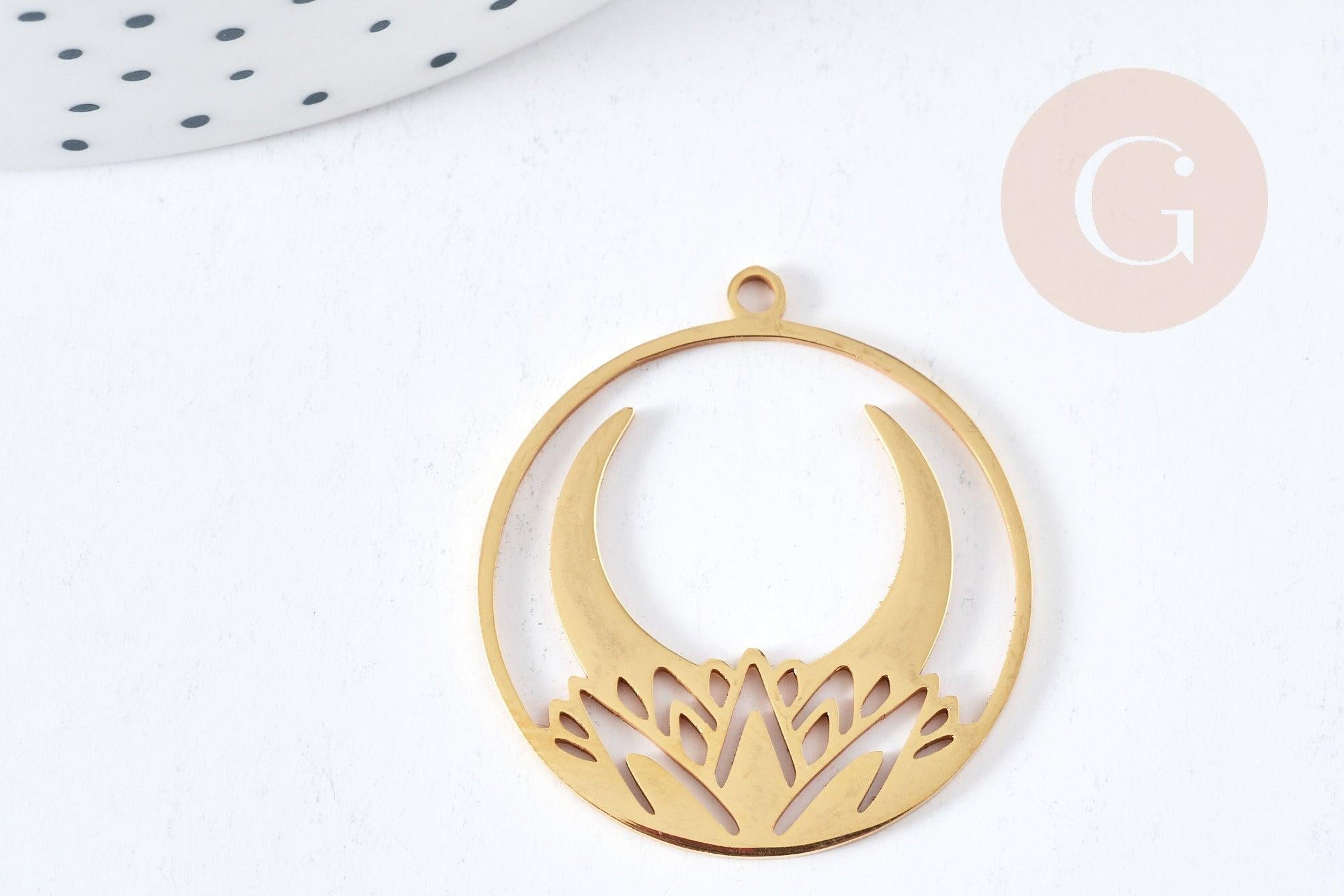 Add a touch of mystery and beauty to your jewelry designs with this beautiful 201 stainless steel gold round pendant . With its delicate design depicting a crescent moon resting on a water lily , this pendant is ideal for lovers of unique and original jewelry.